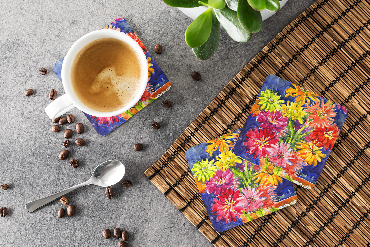 Presenting our Set of 4 Foam Coasters, a stylish and practical addition to your table setting. Each square coaster, measuring 3 1/2 inches by 3 1/2 inches, is perfectly sized to accommodate various drinkware, from coffee mugs to tumblers. These coasters stand out with their full-color artwork, permanently dyed onto the material for a vibrant and fade-resistant finish. They're not just functional, they're a fashionable statement, adding a touch of flair to any gathering or event. Our foam coasters serve a dual purpose - they protect your table from water stains and are perfect for both hot and cold drinks. The material used is similar to that of our high-quality mouse pads, ensuring durability and heat resistance. These coasters are easy to maintain - simply wash them in the top of your dishwasher and lay flat to dry. The design won't come off, ensuring they retain their vivid colors for years. Pair them with one of our insulated coolers or huggers for a cohesive, thoughtful gift set. Enhance your beverage experience with our Set of 4 Foam Coasters.