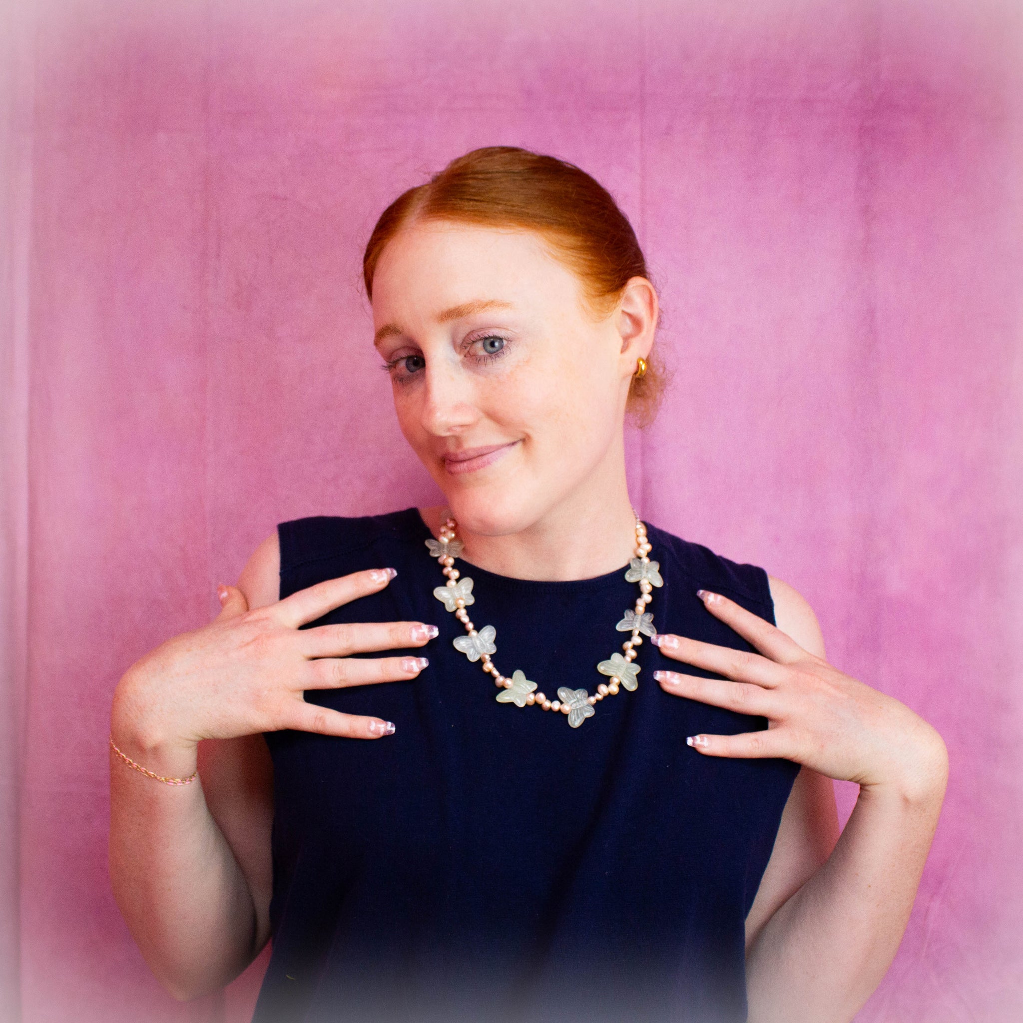 The Forest Fae Pearl Necklace features delicate stone butterfly beads paired with trailing peachy freshwater pearls, creating a graceful and enchanting look. This unique design adds a soft, natural elegance to your outfit, perfect for those seeking a subtle yet captivating accessory.