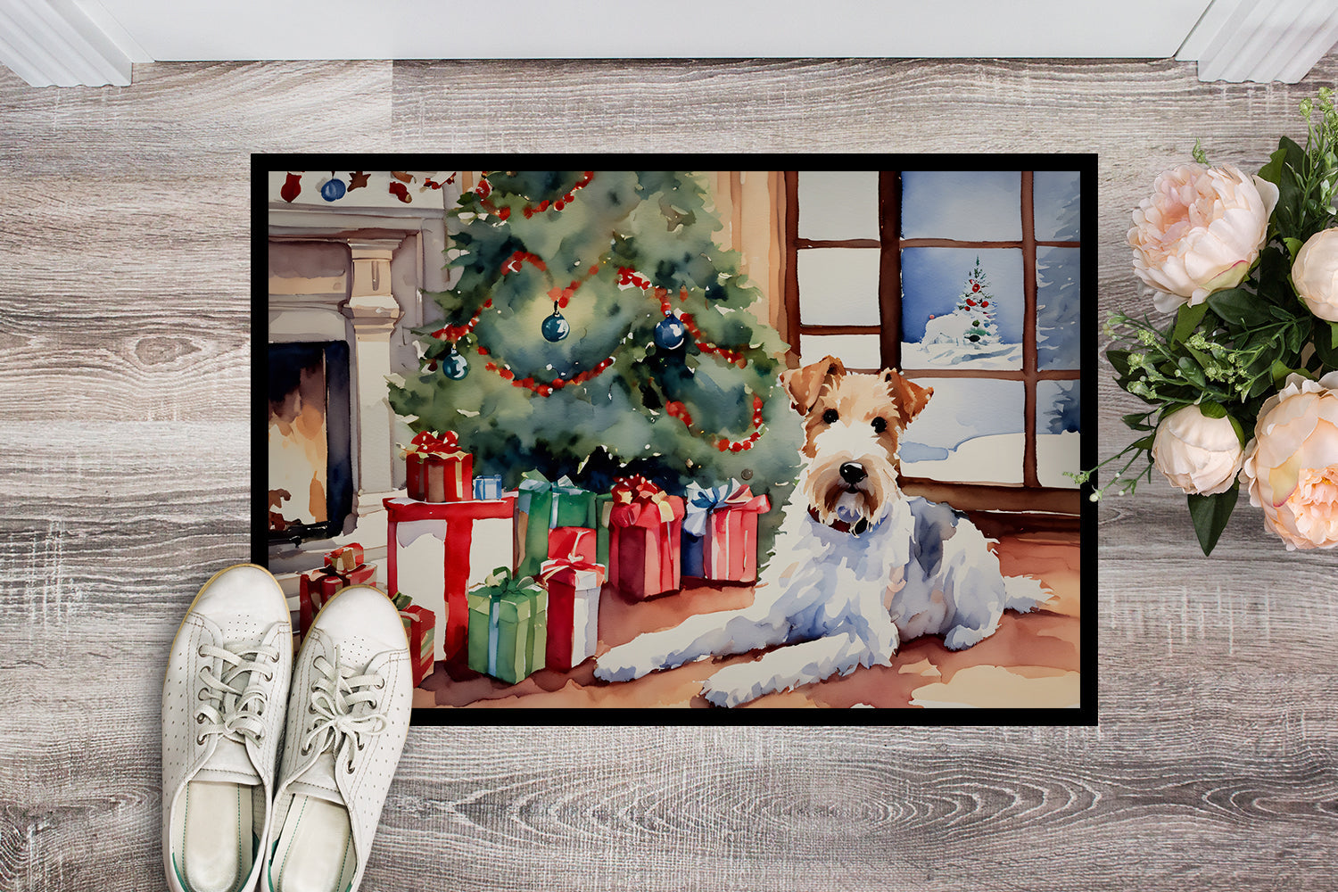 Decorate your space with our Christmas Fox Terrier artwork on a Doormat. Welcome your guests in style with our Artwork Door Mat, designed to withstand almost any weather condition. This mat, measuring approximately 24 by 36 inches, is held together by durable black binding tape. Its top layer, composed of polyester felt, is dyed with the eye-catching image you see on the mat. A few layers below provide the mat with stability, while its rubber bottom is stamped to help prevent slipping and ensures safety. Our mat works wonderfully as both an indoor or outdoor door mat. For cleaning, simply hose it off with water or use a power washer - no need for any cleaner that produces suds. Avoid scrubbing with a brush, instead, opt for the vacuum on floor setting. Designed manufactured and printed in the USA, this mat is a perfect addition to your porch, outdoor kitchen, entryway, or any indoor space. Its unique design makes it a charming decorative rug that greets your guests and adds a stylish touch to your home decor.