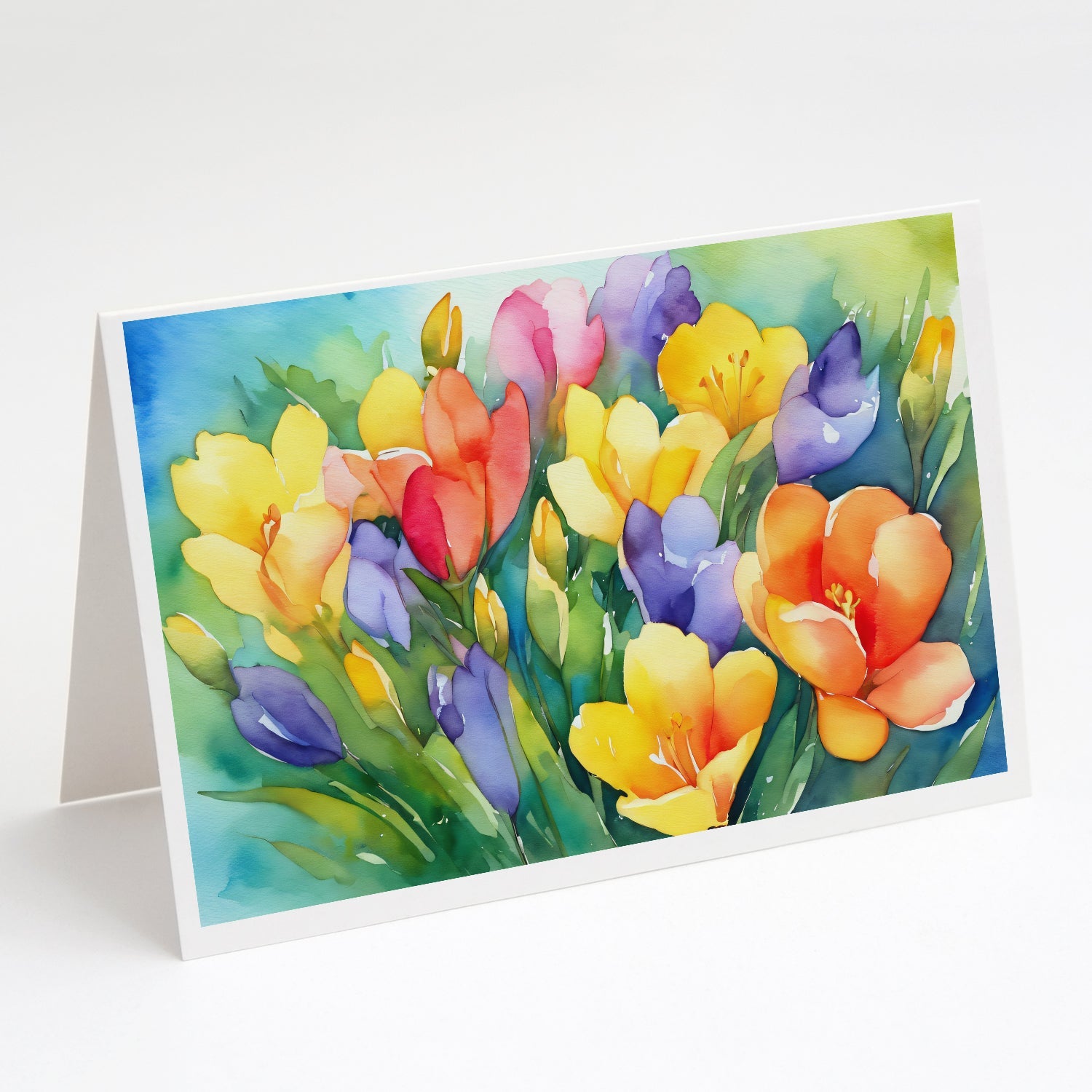 Decorate your space with our Freesias artwork on a . Celebrate special moments with Caroline's Treasures Printed Greeting Card Pack. This pack includes eight beautifully folded 5x7 cards, accompanied by eight matching white envelopes. With blank interiors, these cards provide ample space for your personalized messages and heartfelt holiday greetings. Each card features captivating full-color artwork, meticulously printed in our facility on high-quality 80 lb cover stock or 216 GSM. The super smooth finish of the white cards enhances the visual impact of the artwork, creating a truly stunning presentation. Designed by our talented in-house artists or licensed artists, the artwork on these cards showcases their creativity and attention to detail. From vibrant illustrations to captivating designs, each card tells its own unique story. Whether it's for birthdays, anniversaries, holidays, or any special occasion, Caroline's Treasures Greeting Card Pack is the perfect way to convey your heartfelt sentiments. Share joy, love, and warm wishes with these exquisite cards and make every moment unforgettable.