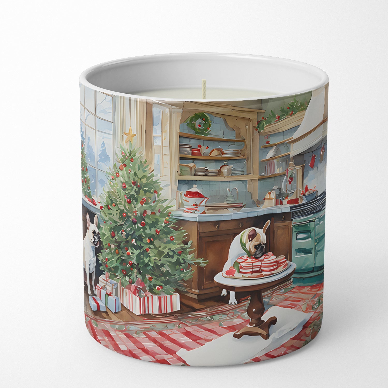 Decorate your space with our Christmas French Bulldog artwork on a 10 oz Soy Candle. Upgrade your ambiance with our Decorative Soy Wax Candle. No more settling for ordinary candles. With a beautifully designed 10 oz container adorned with exclusive artwork from our artists, this candle not only illuminates your space but also adds a touch of elegance to your decor. Crafted with meticulous care, each candle is hand-poured and made from 100% soy wax, ensuring a clean, consistent burn. Free from chemical-based dyes, the all-white wax complements any setting. Our soy wax is paired with high-quality fragrance oils, releasing a robust scent that transforms your surroundings. The candle provides a great deal of burn time, though this may vary based on air flow, burn duration, and wick maintenance. For safe use, always trim the wick to 1/4 inch before lighting and ensure your candle is on a level surface. We recommend not burning for more than four hours at a time and discontinuing use when only 1/4 inch of wax remains. Our Decorative Soy Wax Candle is more than just a candle. It is a piece of art that enhances your space while ensuring a soothing, fragrant ambiance. Remember, always burn within sight, and keep away from flammable objects, pets, and children. Enjoy the beauty and tranquility it brings to your everyday life.