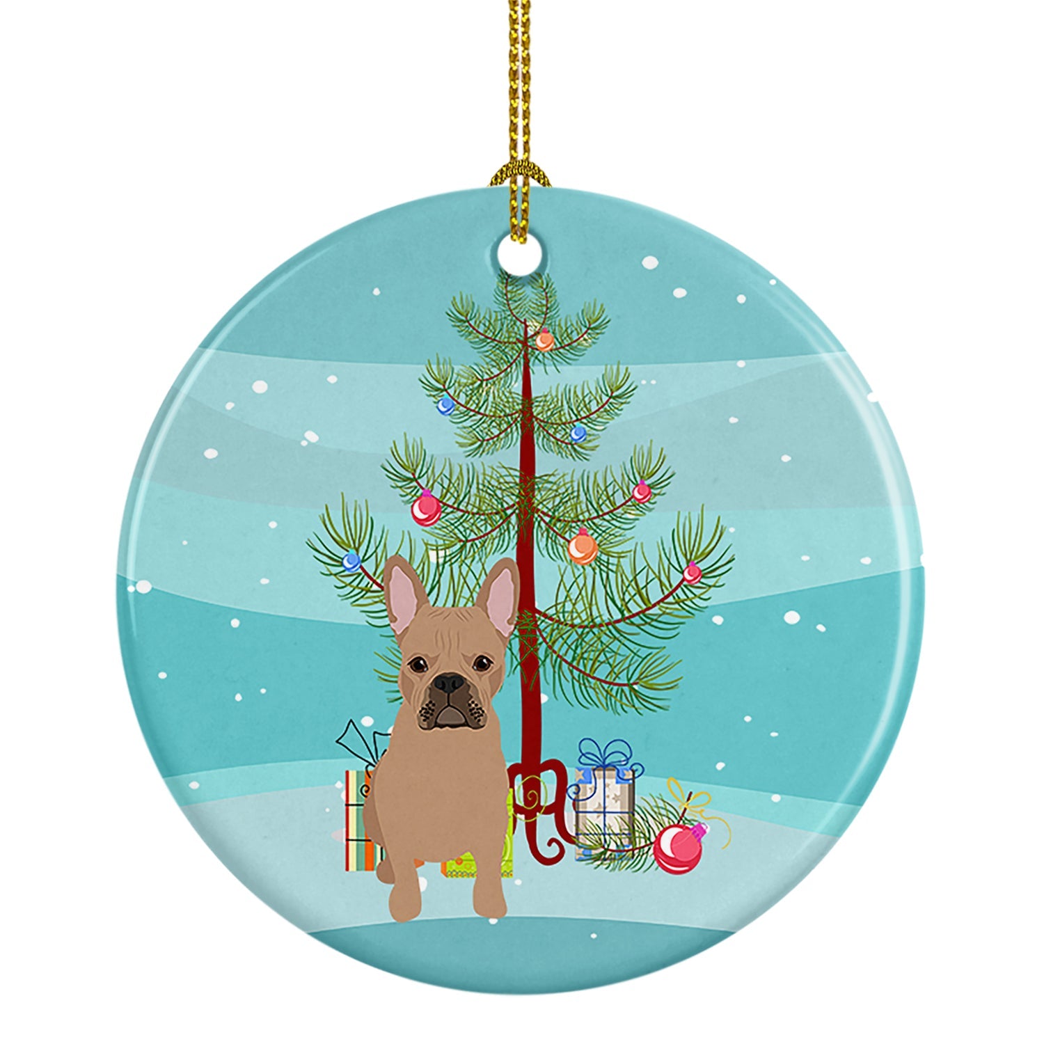 Ceramic Ornament featuring breed specific French Bulldog artwork. Celebrate Christmas with this Christmas Ornament. Add a touch of personalized charm to your Christmas tree this holiday season with our Ceramic Ornament. Measuring 2.8125 inches in diameter, this round porcelain ornament beautifully reflects your festive lights, enhancing your holiday decor. The gloss surface sets off the vibrant, full-color artwork contributed by one of our talented artists, bringing a pop of color and joy to your tree. This Ceramic Ornament doesn't stop at being merely decorative. The white back is designed for personalization. Write a heartfelt message, mark a special year, or inscribe a date with a paint pen or a permanent marker to create a treasured memento. Please ensure you allow any personalization to dry thoroughly before handling to maintain the pristine finish. Included with the ornament is a delicate gold cord for easy hanging. Made in the USA, this Ceramic Ornament makes an exceptional gift for a pet sitter, teacher, family member, or anyone you wish to share a little Christmas magic with. With its blend of style, charm, and personal touch, it's a meaningful addition to any Christmas tree.