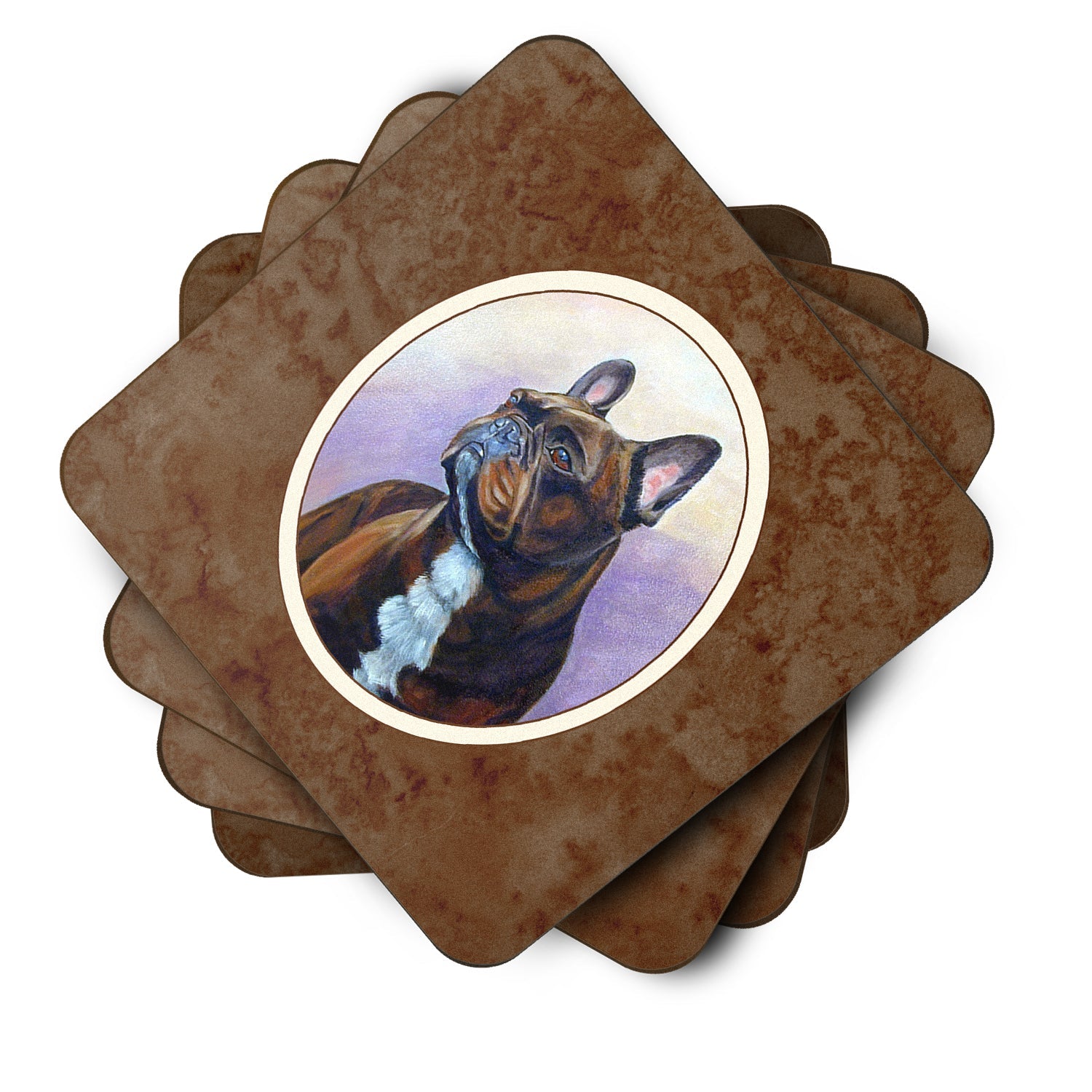 Decorate your space with our French Bulldog artwork on a Coaster set. Presenting our Set of 4 Foam Coasters, a stylish and practical addition to your table setting. Each square coaster, measuring 3 1/2 inches by 3 1/2 inches, is perfectly sized to accommodate various drinkware, from coffee mugs to tumblers. These coasters stand out with their full-color artwork, permanently dyed onto the material for a vibrant and fade-resistant finish. They're not just functional, they're a fashionable statement, adding a touch of flair to any gathering or event. Our foam coasters serve a dual purpose - they protect your table from water stains and are perfect for both hot and cold drinks. The material used is similar to that of our high-quality mouse pads, ensuring durability and heat resistance. These coasters are easy to maintain - simply wash them in the top of your dishwasher and lay flat to dry. The design won't come off, ensuring they retain their vivid colors for years. Pair them with one of our insulated coolers or huggers for a cohesive, thoughtful gift set. Enhance your beverage experience with our Set of 4 Foam Coasters.