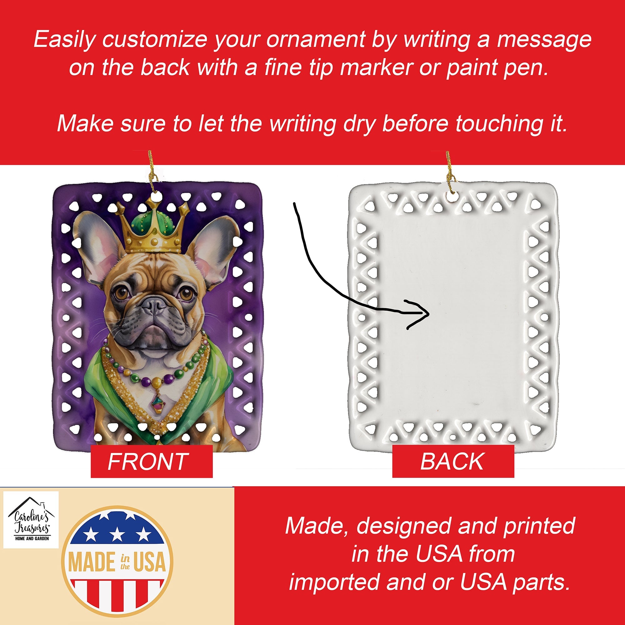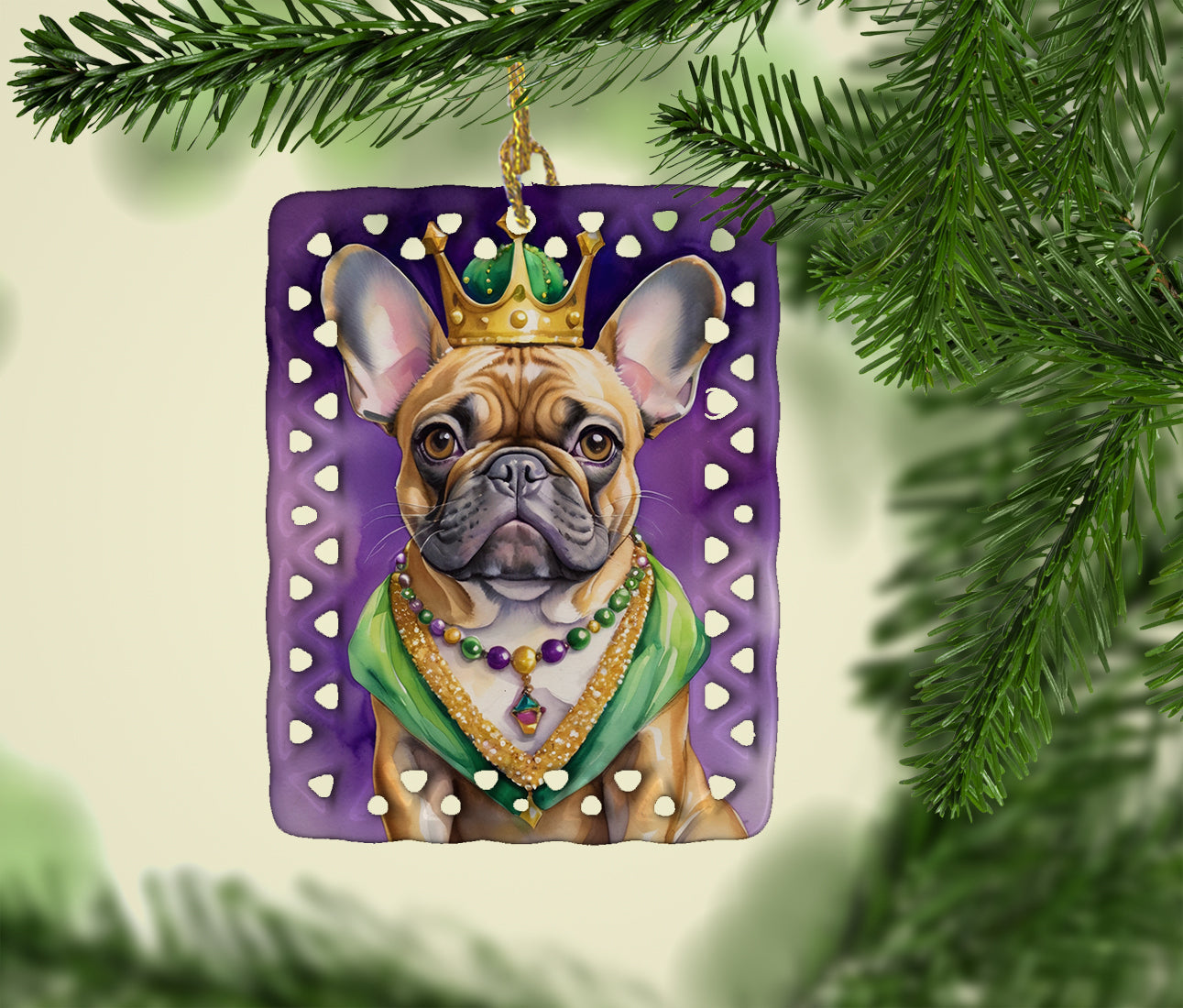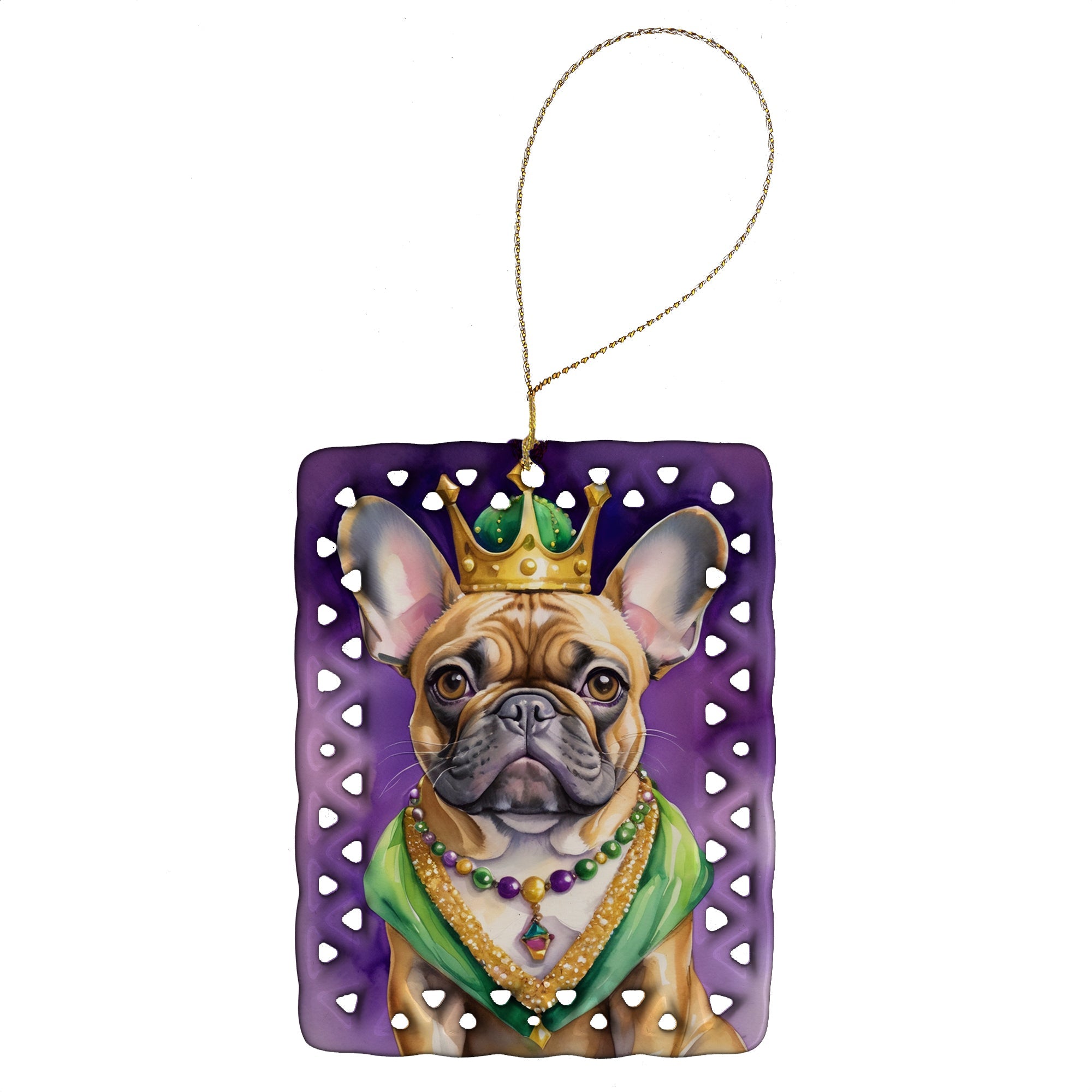 Porcelain Ornament featuring breed specific French Bulldog artwork. Celebrate Mardi Gras with this Mardi Gras Ornament. Add a unique, personal touch to your holiday decor with our Rectangular Lattice Porcelain Ornament. Perfect for creating cherished memories, this high-quality ornament shines under festive lights, reflecting warmth and joy throughout your Christmas tree. Crafted with a glossy finish, it showcases vibrant, full-color artwork contributed by our talented artists, ensuring your tree is adorned with a burst of color and holiday spirit. What sets this Porcelain Ornament apart is its customizable white back. Use a paint pen or permanent marker to write a heartfelt message, commemorate a special year, or mark an unforgettable date, turning this ornament into a keepsake that will be treasured for years to come. For best results, allow any personalization to dry thoroughly before handling. Each ornament comes complete with a delicate gold cord, making it easy to hang and display. Proudly made in the USA, this ornament measures 3.375 x 2.625 inches and is a thoughtful gift for pet sitters, teachers, family members, or anyone who would appreciate a little extra holiday magic. Bring style, charm, and a touch of personal meaning to your Christmas tree with this beautifully designed ornament..