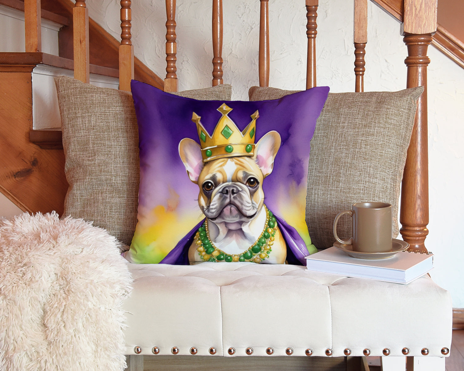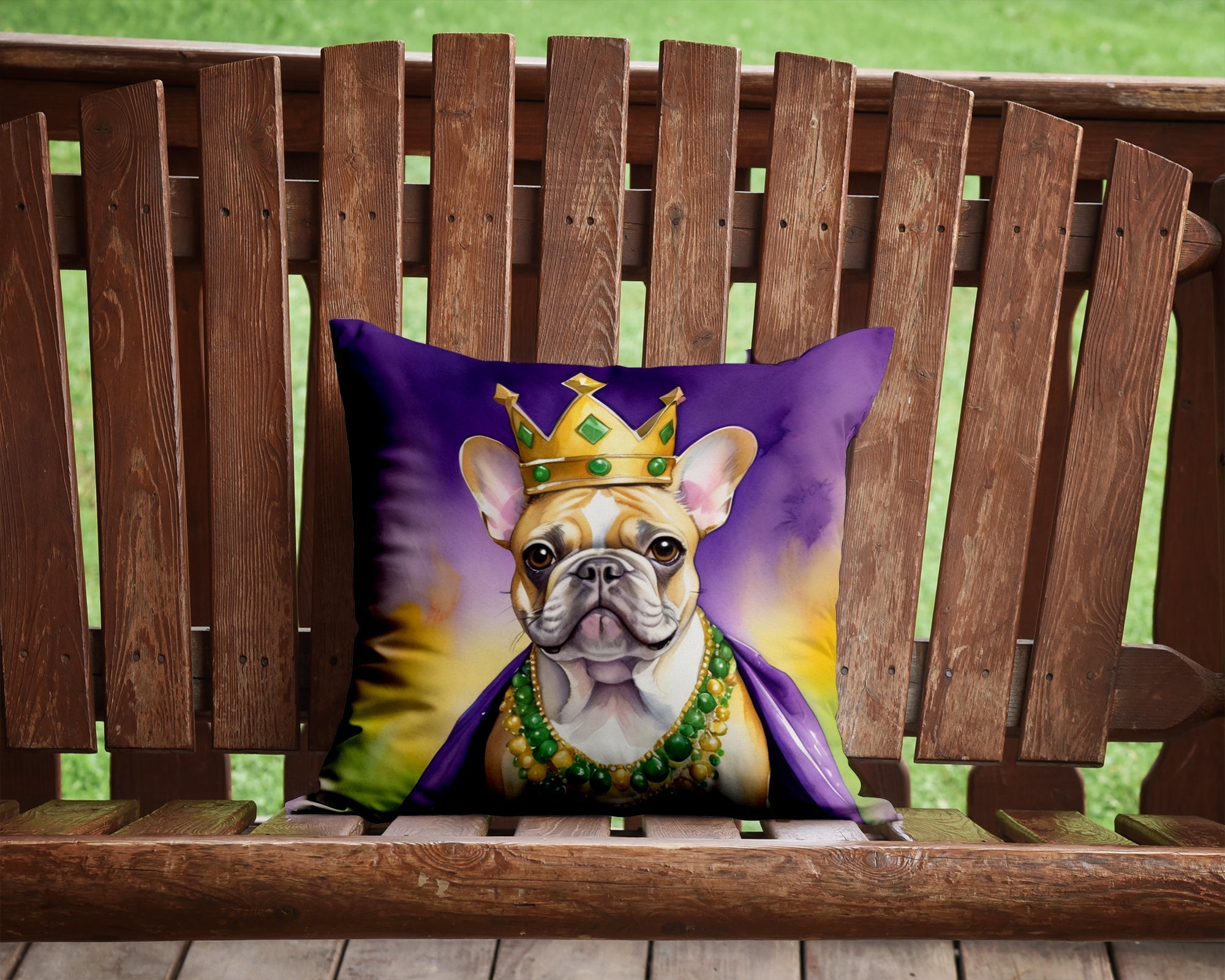 Throw Pillow featuring breed specific French Bulldog artwork. Celebrate Mardi Gras with this Mardi Gras Pillow. Add a touch of vibrancy and comfort to your outdoor seating with Caroline's Treasures Fabric Decorative Pillow. Measuring approximately 14 inches by 14 inches, this outdoor pillow is crafted to elevate the appeal of your patio furniture, infusing it with vivid color and artistic flair. The pillow includes a 100% Polyester Fabric sham filled with a quality pillow form to provide superior comfort. Innovatively made from our brand new material, specifically woven for its water resistance, this pillow is designed for durability. The soft canvas fabric offers versatility in use, fit for your indoor couch or your outdoor patio, porch, or veranda. The fabric is dyed with colorfast dyes built for resilience against weather conditions, ensuring the pillow retains its beauty over time. Constructed by sewing three fabric pieces to create a sham, the polyester insert is then nestled inside to form the pillow, resulting in an overstuffed pillow that maintains its shape. Both the sham and the pillow insert are proudly made in the United States. As the pillows are handcrafted, there may be minor variations in size, further enhancing their unique charm. Experience comfort in style with Caroline's Treasures Fabric Decorative Pillow.