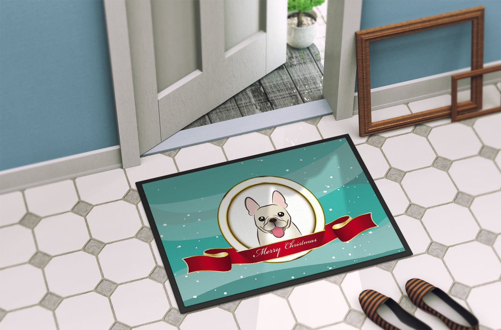Decorate your space with our Christmas French Bulldog artwork on a Doormat. Welcome your guests in style with our Artwork Door Mat, designed to withstand almost any weather condition. This mat, measuring approximately 24 by 36 inches, is held together by durable black binding tape. Its top layer, composed of polyester felt, is dyed with the eye-catching image you see on the mat. A few layers below provide the mat with stability, while its rubber bottom is stamped to help prevent slipping and ensures safety. Our mat works wonderfully as both an indoor or outdoor door mat. For cleaning, simply hose it off with water or use a power washer - no need for any cleaner that produces suds. Avoid scrubbing with a brush, instead, opt for the vacuum on floor setting. Designed manufactured and printed in the USA, this mat is a perfect addition to your porch, outdoor kitchen, entryway, or any indoor space. Its unique design makes it a charming decorative rug that greets your guests and adds a stylish touch to your home decor.