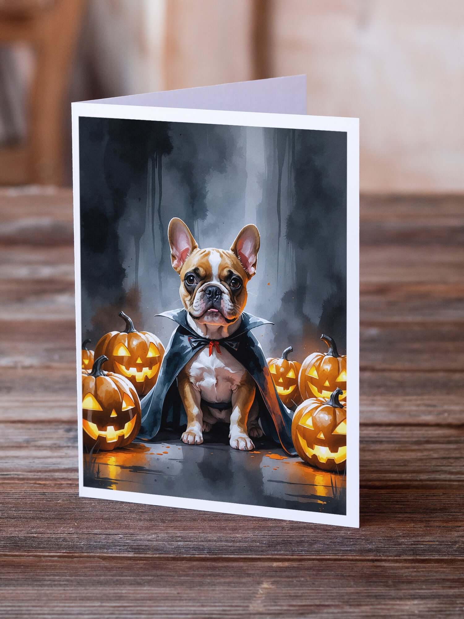 Greeting Cards Pack of 8 featuring breed specific French Bulldog artwork. Celebrate Halloween with this Halloween . Celebrate special moments with Caroline's Treasures Printed Greeting Card Pack. This pack includes eight beautifully folded 5x7 cards, accompanied by eight matching white envelopes. With blank interiors, these cards provide ample space for your personalized messages and heartfelt holiday greetings. Each card features captivating full-color artwork, meticulously printed in our facility on high-quality 80 lb cover stock or 216 GSM. The super smooth finish of the white cards enhances the visual impact of the artwork, creating a truly stunning presentation. Designed by our talented in-house artists or licensed artists, the artwork on these cards showcases their creativity and attention to detail. From vibrant illustrations to captivating designs, each card tells its own unique story. Whether it's for birthdays, anniversaries, holidays, or any special occasion, Caroline's Treasures Greeting Card Pack is the perfect way to convey your heartfelt sentiments. Share joy, love, and warm wishes with these exquisite cards and make every moment unforgettable.