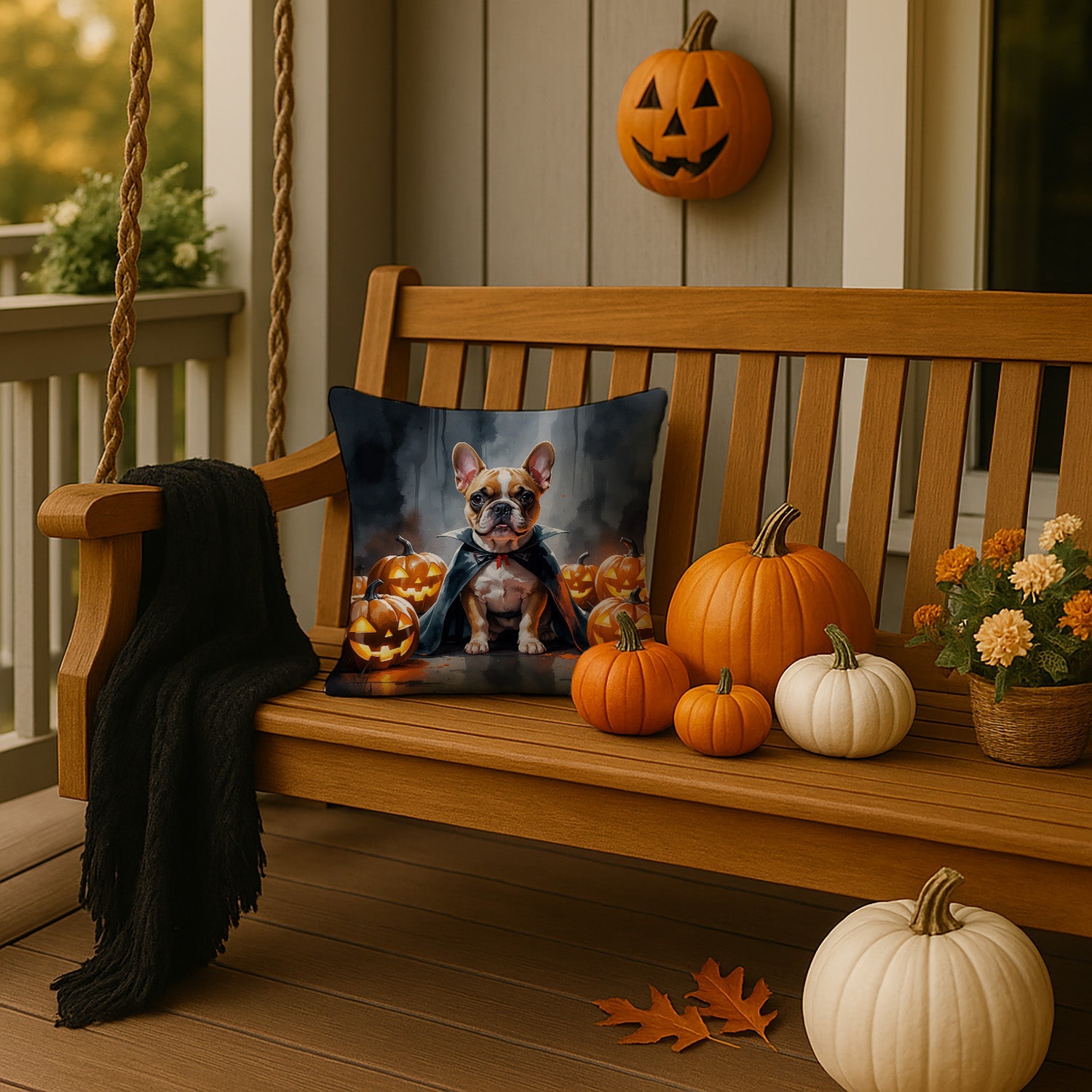 Throw Pillow featuring breed specific French Bulldog artwork. Celebrate Halloween with this Halloween Pillow. Add a touch of vibrancy and comfort to your outdoor seating with Caroline's Treasures Fabric Decorative Pillow. Measuring approximately 14 inches by 14 inches, this outdoor pillow is crafted to elevate the appeal of your patio furniture, infusing it with vivid color and artistic flair. The pillow includes a 100% Polyester Fabric sham filled with a quality pillow form to provide superior comfort. Innovatively made from our brand new material, specifically woven for its water resistance, this pillow is designed for durability. The soft canvas fabric offers versatility in use, fit for your indoor couch or your outdoor patio, porch, or veranda. The fabric is dyed with colorfast dyes built for resilience against weather conditions, ensuring the pillow retains its beauty over time. Constructed by sewing three fabric pieces to create a sham, the polyester insert is then nestled inside to form the pillow, resulting in an overstuffed pillow that maintains its shape. Both the sham and the pillow insert are proudly made in the United States. As the pillows are handcrafted, there may be minor variations in size, further enhancing their unique charm. Experience comfort in style with Caroline's Treasures Fabric Decorative Pillow.