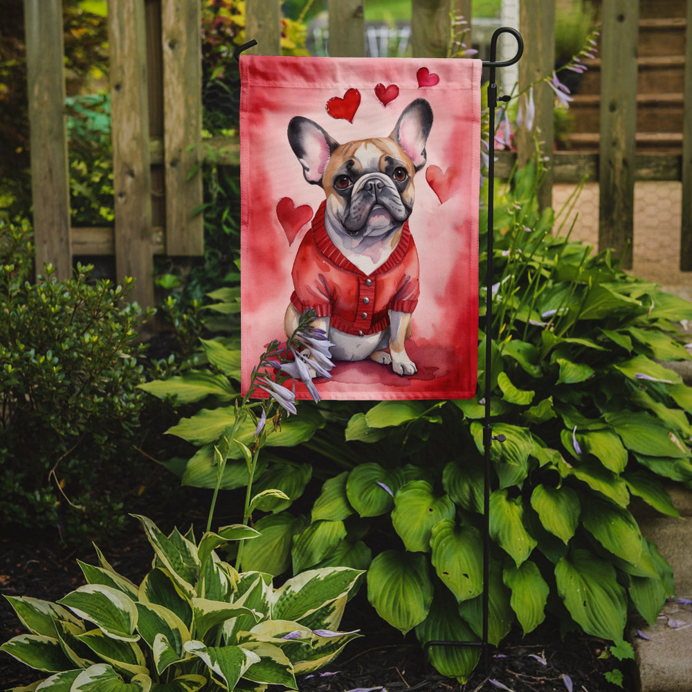 Decorate your space with our Valentine's Day French Bulldog artwork on a Garden Flag. Enhance the beauty of your garden, patio, or yard with Caroline's Treasures Decorative Garden Flag, proudly made in the USA. Crafted from two pieces of thick, double-sided polyester fabric, this 2-ply garden flag is designed to withstand various weather conditions, making it water-resistant and weatherproof. Featuring correctly readable words on both sides, this garden flag offers a delightful visual experience from any angle. With its heavier weight, it stands out among other garden flags, ensuring stability and durability even in wind, rain, and snow. Measuring approximately 11 1/4 inches by 15 1/2 inches, this flag allows you to personalize your outdoor decor. It comes with a 1 1/2-inch sleeve sewn in, allowing easy attachment to any standard garden flag stand or garden size porch hanger (sold separately). Make a statement in your outdoor space with Caroline's Treasures Decorative Garden Flag, a vibrant and high-quality flag that adds color and personality to your surroundings. Proudly made in the USA, it's a symbol of quality craftsmanship and attention to detail.