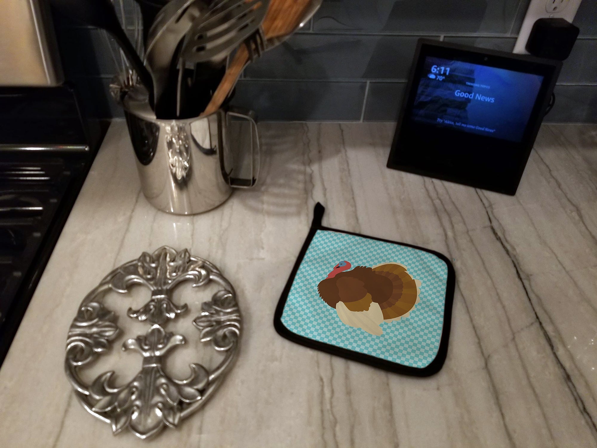 Decorate your space with our French Turkey Dindon artwork on a Pair of Pot Holders. A Pair of Pot Holders to match your kitchen decor. Made in the USA these are thick and functional. Full color artwork decorates the front polyester fabric of the hot pad and accented by a black trim. Use these at as a trivet for your Thanksgiving or Christmas tablescape. Filled with insulated fabric and quilted for durability. These colorful pot holders will make a great gift for your favorite home cook or executive chef. Each pot holder measures approximately 7 1/2 inches by 7 1/2 inches. A hanging tab is included.