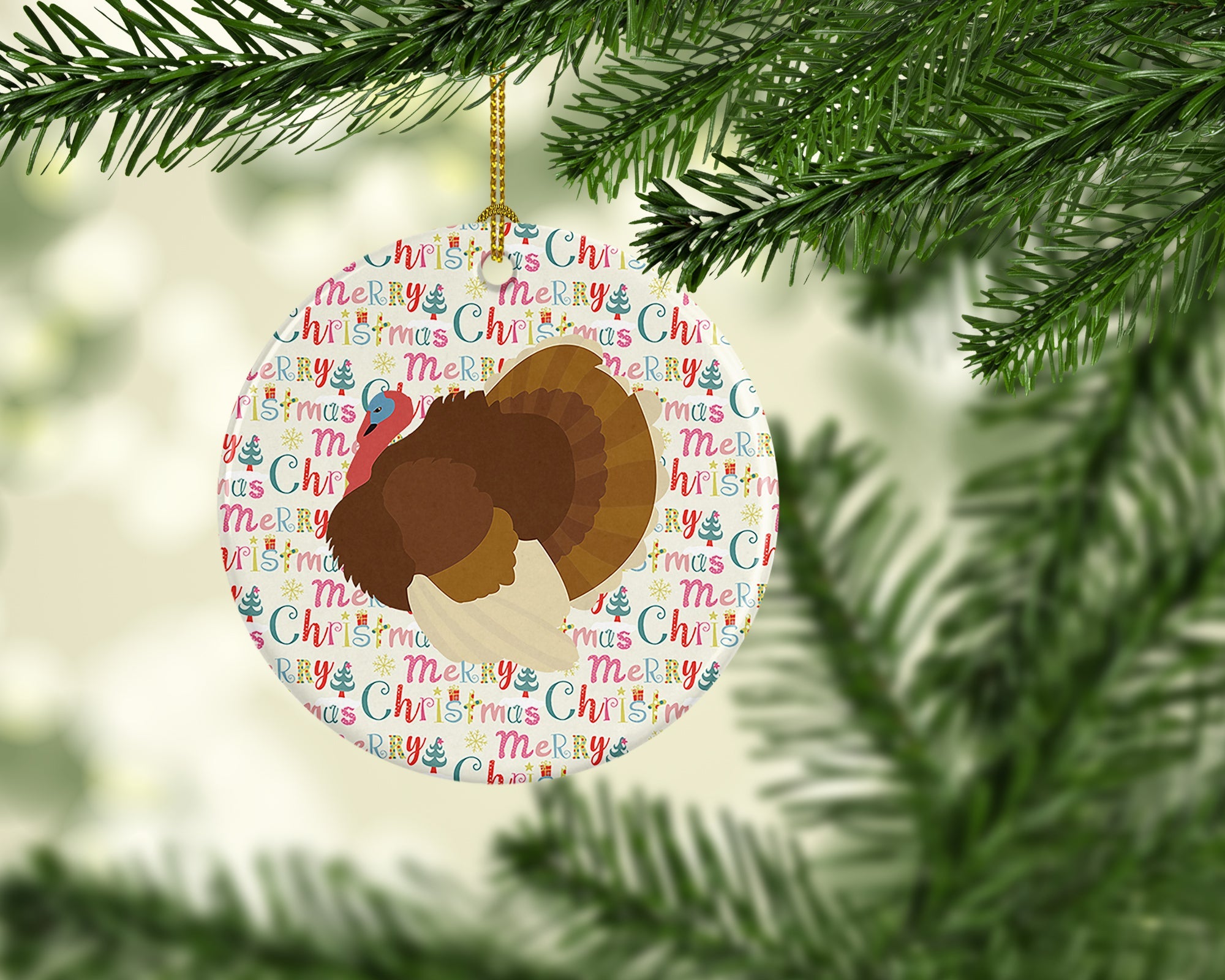 Decorate your space with our Christmas French Turkey Dindon artwork on a Ornament. Add a touch of personalized charm to your Christmas tree this holiday season with our Ceramic Ornament. Measuring 2.8125 inches in diameter, this round porcelain ornament beautifully reflects your festive lights, enhancing your holiday decor. The gloss surface sets off the vibrant, full-color artwork contributed by one of our talented artists, bringing a pop of color and joy to your tree. This Ceramic Ornament doesn't stop at being merely decorative. The white back is designed for personalization. Write a heartfelt message, mark a special year, or inscribe a date with a paint pen or a permanent marker to create a treasured memento. Please ensure you allow any personalization to dry thoroughly before handling to maintain the pristine finish. Included with the ornament is a delicate gold cord for easy hanging. Made in the USA, this Ceramic Ornament makes an exceptional gift for a pet sitter, teacher, family member, or anyone you wish to share a little Christmas magic with. With its blend of style, charm, and personal touch, it's a meaningful addition to any Christmas tree.