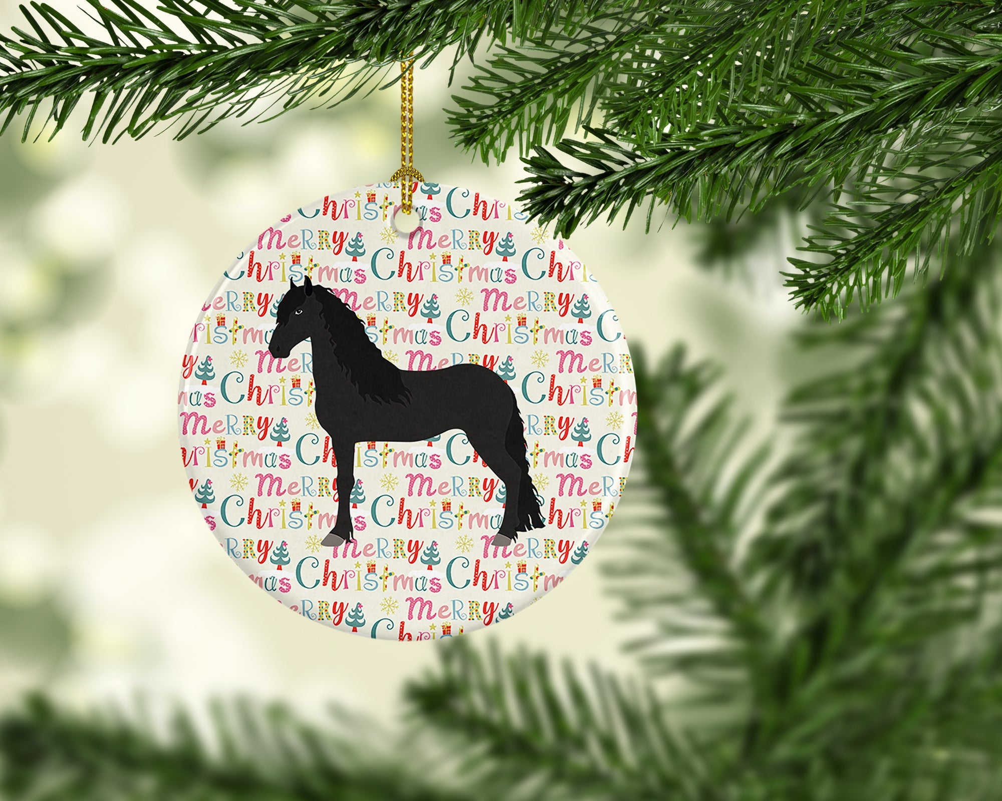 Decorate your space with our Christmas Friesian Horse artwork on a Ornament. Add a touch of personalized charm to your Christmas tree this holiday season with our Ceramic Ornament. Measuring 2.8125 inches in diameter, this round porcelain ornament beautifully reflects your festive lights, enhancing your holiday decor. The gloss surface sets off the vibrant, full-color artwork contributed by one of our talented artists, bringing a pop of color and joy to your tree. This Ceramic Ornament doesn't stop at being merely decorative. The white back is designed for personalization. Write a heartfelt message, mark a special year, or inscribe a date with a paint pen or a permanent marker to create a treasured memento. Please ensure you allow any personalization to dry thoroughly before handling to maintain the pristine finish. Included with the ornament is a delicate gold cord for easy hanging. Made in the USA, this Ceramic Ornament makes an exceptional gift for a pet sitter, teacher, family member, or anyone you wish to share a little Christmas magic with. With its blend of style, charm, and personal touch, it's a meaningful addition to any Christmas tree.