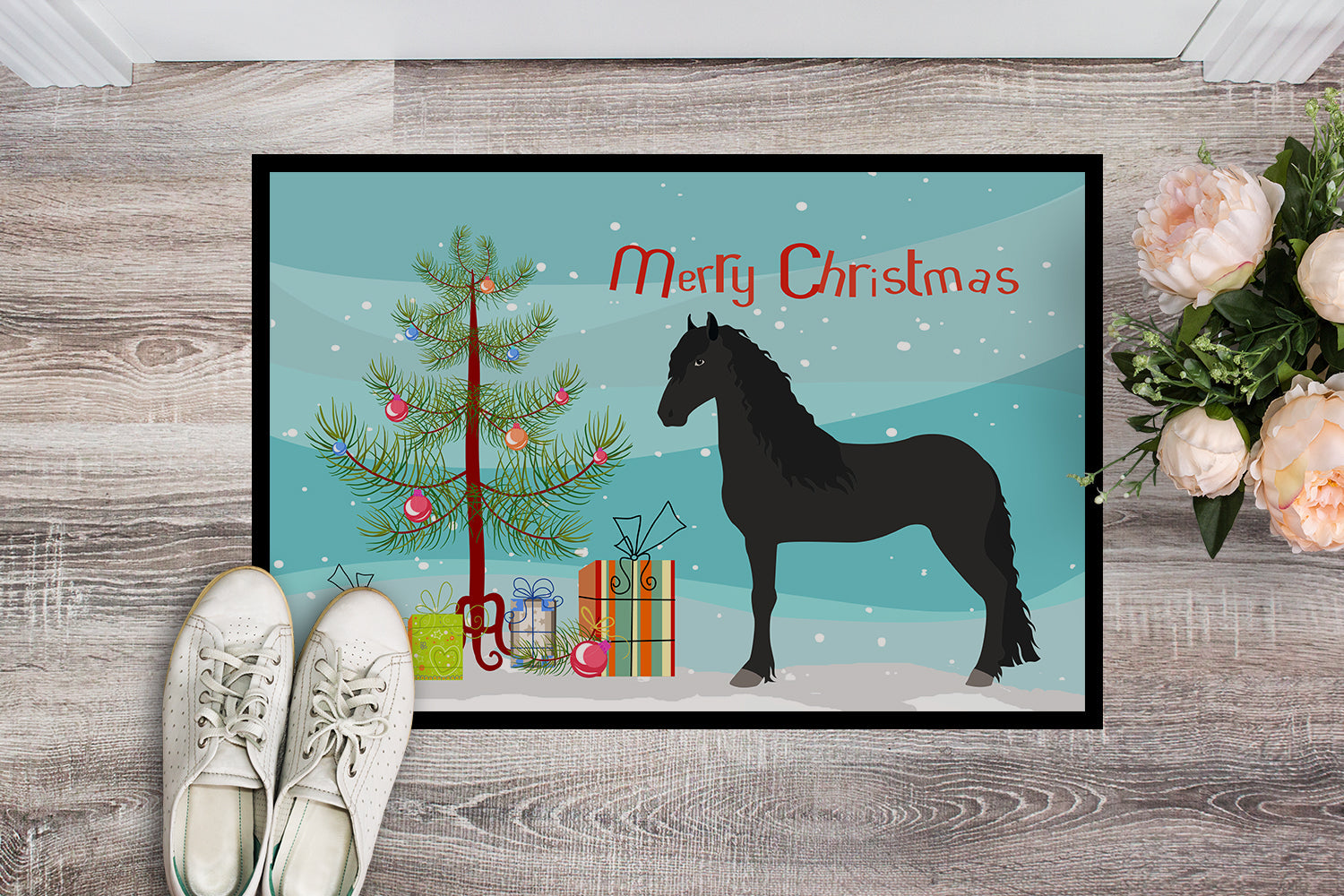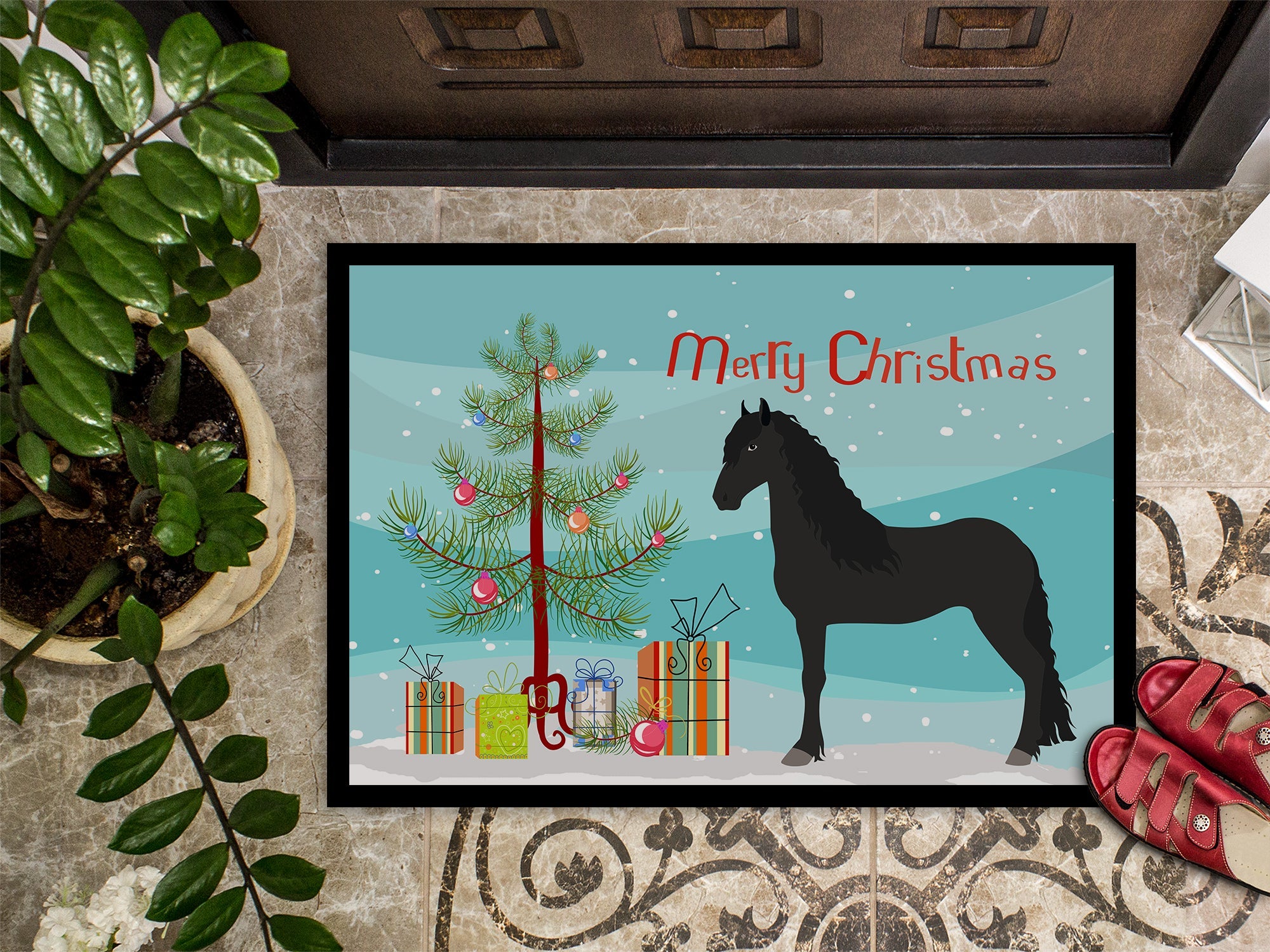 Decorate your space with our Christmas Friesian Horse artwork on a Doormat. Welcome your guests in style with our Artwork Door Mat, designed to withstand almost any weather condition. This mat, measuring approximately 24 by 36 inches, is held together by durable black binding tape. Its top layer, composed of polyester felt, is dyed with the eye-catching image you see on the mat. A few layers below provide the mat with stability, while its rubber bottom is stamped to help prevent slipping and ensures safety. Our mat works wonderfully as both an indoor or outdoor door mat. For cleaning, simply hose it off with water or use a power washer - no need for any cleaner that produces suds. Avoid scrubbing with a brush, instead, opt for the vacuum on floor setting. Designed manufactured and printed in the USA, this mat is a perfect addition to your porch, outdoor kitchen, entryway, or any indoor space. Its unique design makes it a charming decorative rug that greets your guests and adds a stylish touch to your home decor.