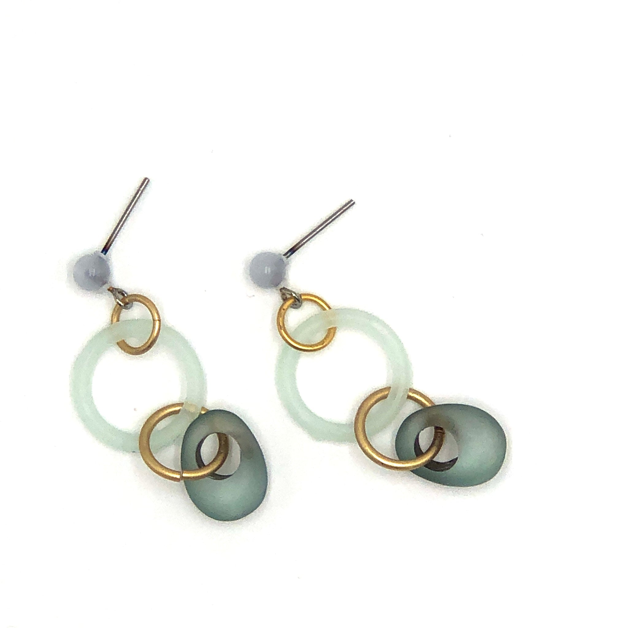 Frosted teal blue drops mesh with mint frosted links in alongside frosted gold metal links. Finished off with an ice blue moonglow tiny stud, these earrings mesh retro statement looks with minimalist style. Each measures about 2" in length.