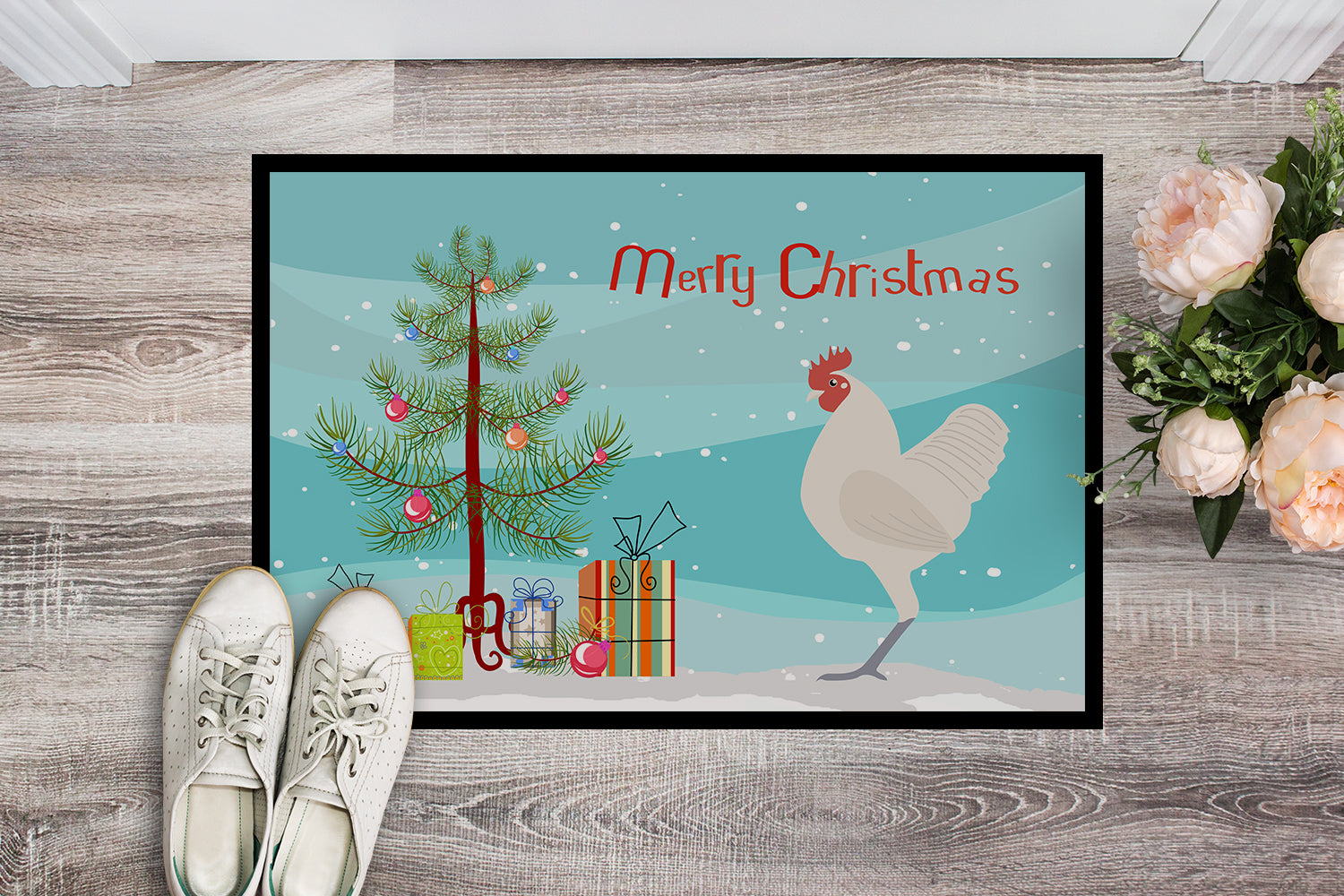 Decorate your space with our Christmas German Langshan Chicken artwork on a Doormat. Welcome your guests in style with our Artwork Door Mat, designed to withstand almost any weather condition. This mat, measuring approximately 18 by 27 inches, is held together by durable black binding tape. Its top layer, composed of polyester felt, is dyed with the eye-catching image you see on the mat. A few layers below provide the mat with stability, while its rubber bottom is stamped to help prevent slipping and ensures safety. Our mat works wonderfully as both an indoor or outdoor door mat. For cleaning, simply hose it off with water or use a power washer - no need for any cleaner that produces suds. Avoid scrubbing with a brush, instead, opt for the vacuum on floor setting. Designed manufactured and printed in the USA, this mat is a perfect addition to your porch, outdoor kitchen, entryway, or any indoor space. Its unique design makes it a charming decorative rug that greets your guests and adds a stylish touch to your home decor.