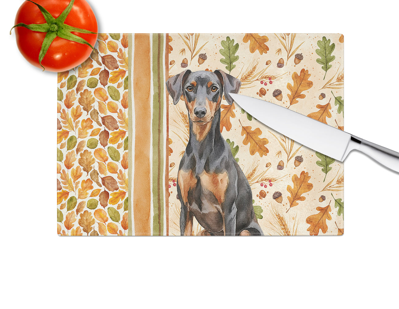Glass Cutting Board featuring breed specific German Pinscher artwork. Celebrate Thanksgiving with this Thanksgiving Cutting Board. Introduce your kitchen to the vibrant, large Decorative Glass Cutting Board from Caroline's Treasures. Crafted from resilient tempered glass, this board is not only a utilitarian necessity but also a colorful art piece. With its generous dimensions of 15 inches in height and 12 inches in length, it offers ample space for all your cutting needs. Every piece showcases captivating artwork from distinguished artists, bringing an aesthetic edge to your kitchen. Beyond its attractive design, this cutting board ensures your countertop stays pristine and unscathed, owing to its heat-resistant properties. Engineered with user convenience in mind, it features non-skid feet for stability, and rounded corners for additional safety. Its robust construction renders it virtually unbreakable, guaranteeing longevity. The board comes with protective feet bumpers, maintaining its position during use. This product is recommended to be hand washed only. Proudly printed and assembled in the United States, this cutting board exemplifies superior craftsmanship. With Caroline's Treasures' Decorative Glass Cutting Board, you're investing in a blend of functionality and artistic flair.