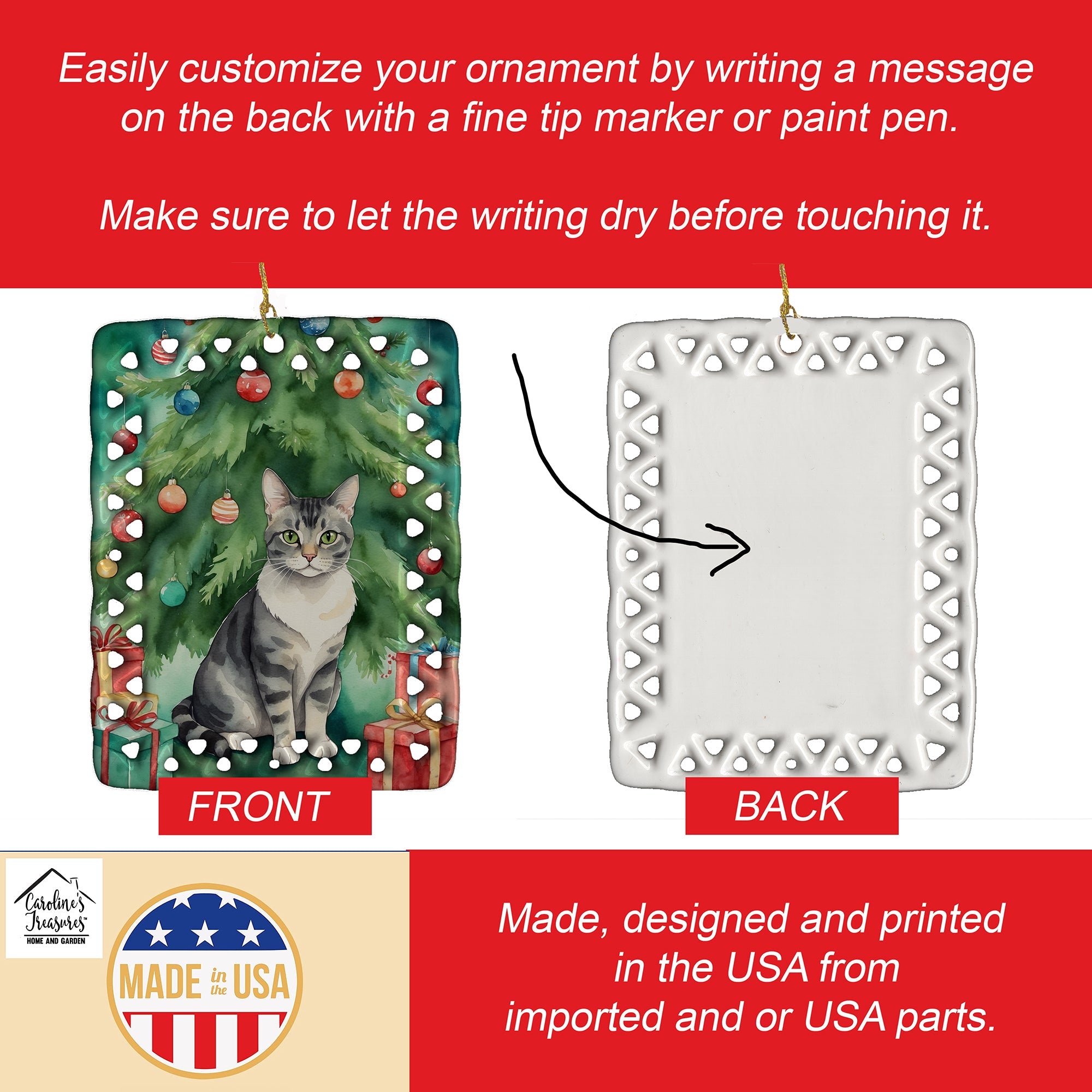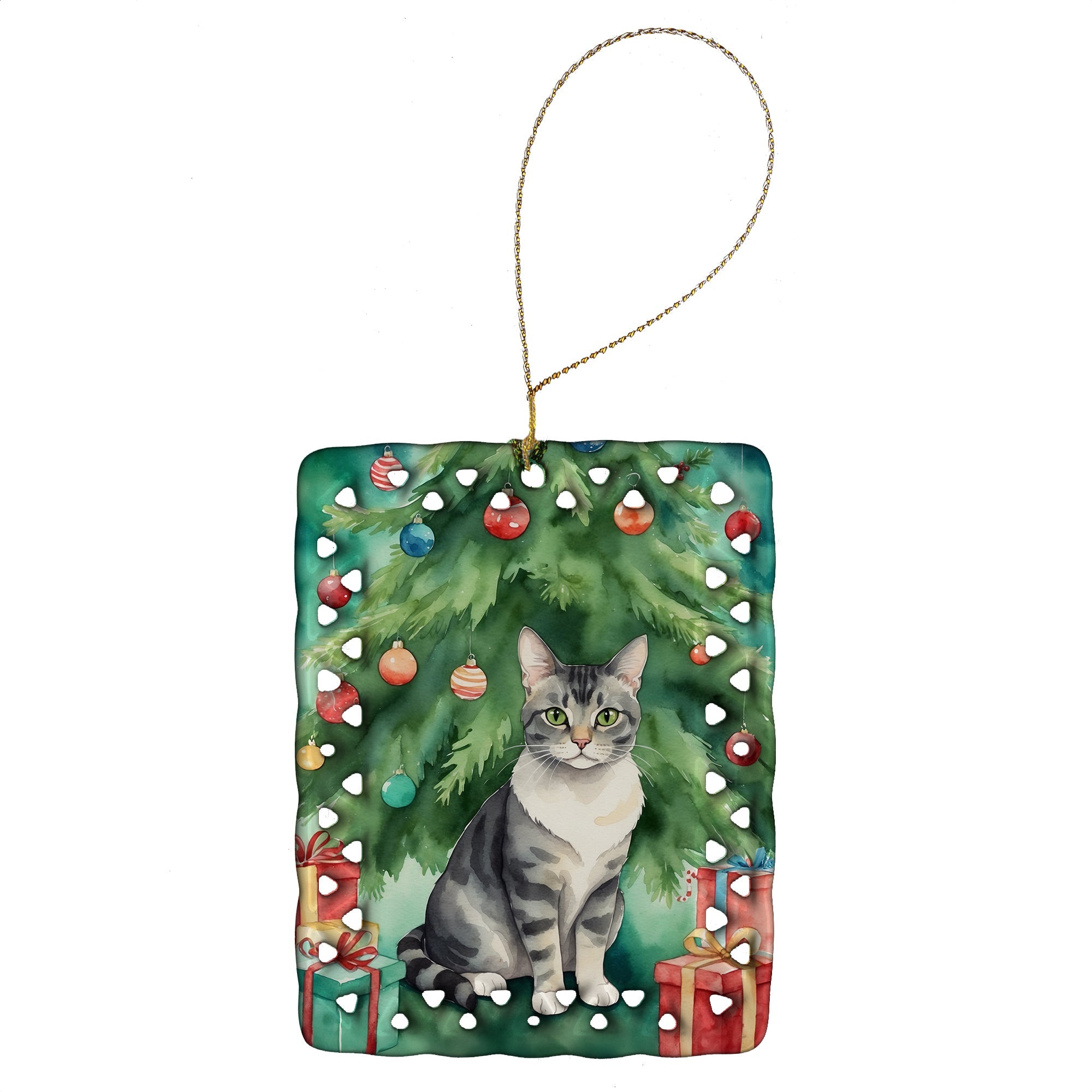 Porcelain Ornament featuring breed specific German Rex artwork. Celebrate Christmas with this Christmas Ornament. Add a unique, personal touch to your holiday decor with our Rectangular Lattice Porcelain Ornament. Perfect for creating cherished memories, this high-quality ornament shines under festive lights, reflecting warmth and joy throughout your Christmas tree. Crafted with a glossy finish, it showcases vibrant, full-color artwork contributed by our talented artists, ensuring your tree is adorned with a burst of color and holiday spirit. What sets this Porcelain Ornament apart is its customizable white back. Use a paint pen or permanent marker to write a heartfelt message, commemorate a special year, or mark an unforgettable date, turning this ornament into a keepsake that will be treasured for years to come. For best results, allow any personalization to dry thoroughly before handling. Each ornament comes complete with a delicate gold cord, making it easy to hang and display. Proudly made in the USA, this ornament measures 3.375 x 2.625 inches and is a thoughtful gift for pet sitters, teachers, family members, or anyone who would appreciate a little extra holiday magic. Bring style, charm, and a touch of personal meaning to your Christmas tree with this beautifully designed ornament..
