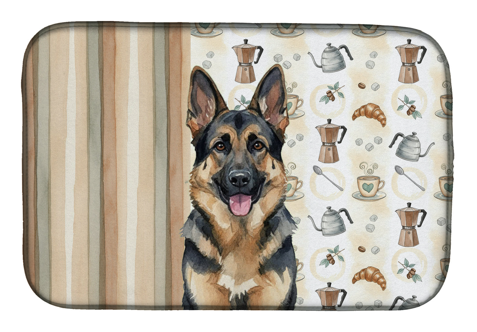 Shown here is the German Shepherd Coffee Bar Dish Drying Mat from Caroline's Treasures featuring artwork of a German Shepherd in a Everyday design. The detailed illustration and vibrant colors make it a standout accent that celebrates both seasonal style and love for the subject. This image features a cozy watercolor coffee-themed pattern with illustrated mugs, moka pots, kettles, croissants, coffee beans, and sugar cubes arranged in a repeating design. Soft neutral tones with warm browns, creams, and subtle sage accents create an inviting, café-inspired look that feels comforting and relaxed. Everyday décor celebrates personal style and the small moments that make a house feel like home. Thoughtful designs add warmth and personality that can be enjoyed year-round. Say goodbye to messy countertops and soggy dish towels with our innovative dish drying mat. Our high-quality dish drying pad is designed to keep your countertops dry while offering a stylish and efficient solution. Whether you're air drying dishes, glasses, stemware, silverware, pots, pans, bottles, or even fruits and vegetables, our dish mat is the perfect choice. The 14 inches x 21 inches size fits most counters and dish drying racks, and the non-slip design ensures stability. Made with water-absorbent polyester and a polyurethane foam insert, our dish drying mat is not only functional but also durable. It's machine washable and printed in the USA for long-lasting use. The beautiful artwork adds flair to your kitchen decor, making it a perfect housewarming gift or present for any occasion. Upgrade your kitchen experience with our absorbent and versatile dish drying mat. Perfect for: Kitchen counters and sinks, everyday dish drying and countertop protection, Dogs-themed homes, or year-round use for German Shepherd lovers. German Shepherds are intelligent working dogs known for their loyalty and versatility. This highly respected breed is valued for its trainability, courage, and strong bond with family. Makes a heartfelt gift for: German Shepherd owners, Dogs lovers, Everyday gifts, pet parents, friends who adore their German Shepherd, or anyone celebrating Dogs.