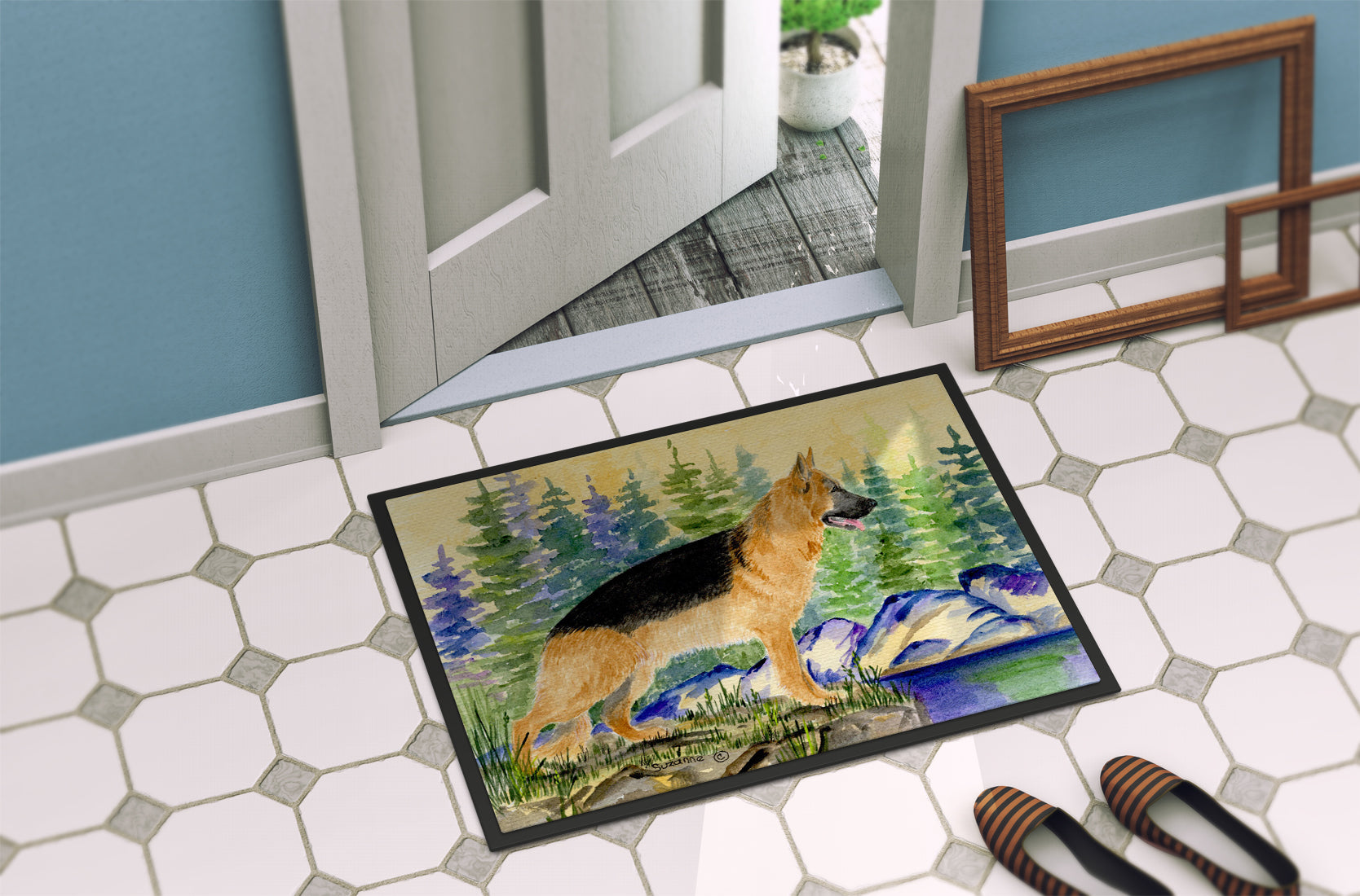 Decorate your space with our German Shepherd artwork on a Doormat. Welcome your guests in style with our Artwork Door Mat, designed to withstand almost any weather condition. This mat, measuring approximately 24 by 36 inches, is held together by durable black binding tape. Its top layer, composed of polyester felt, is dyed with the eye-catching image you see on the mat. A few layers below provide the mat with stability, while its rubber bottom is stamped to help prevent slipping and ensures safety. Our mat works wonderfully as both an indoor or outdoor door mat. For cleaning, simply hose it off with water or use a power washer - no need for any cleaner that produces suds. Avoid scrubbing with a brush, instead, opt for the vacuum on floor setting. Designed manufactured and printed in the USA, this mat is a perfect addition to your porch, outdoor kitchen, entryway, or any indoor space. Its unique design makes it a charming decorative rug that greets your guests and adds a stylish touch to your home decor.