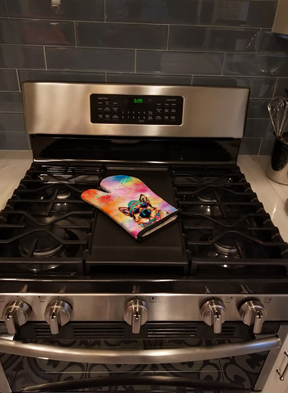 Decorate your space with our German Shepherd artwork on a Oven Mitt. Bring a bit of Summer into your home with a Summer Oven Mitt. Presenting our Large Right Hand Thick Heat Resistant Oven Mitt, an indispensable tool for any culinary enthusiast. This mitt boasts layers of quilted protection on both sides, providing outstanding resistance against extreme heat. Embellished with beautifully printed artwork, it adds an extra dash of charm to your kitchen decor. At about 12 inches long and 8 1/2 inches wide, this oven mitt offers a generous fit, accommodating a diverse range of hand sizes. Its design is enhanced by a sleek Black bias tape trim, finished with a convenient hoop for easy hanging. Fresh out of the packaging, the quilting process may give the mitt a stiff feel, but rest assured, it will soften with use and washing. Our mitt is crafted with a unique center fabric, Insul-Bright, a composite material made from polyester fibers, needle-punched through a nonwoven substrate and a reflective metallized film. This smart material resists both conduction and radiant energy, reflecting heat back to its source, all while remaining breathable. Our oven mitt is machine washable and safe for tumble drying. It's a perfect gift for your favorite Chef, BBQ enthusiast, or just a little treat for yourself! Experience safety, style, and convenience rolled into one with this exceptional oven mitt.