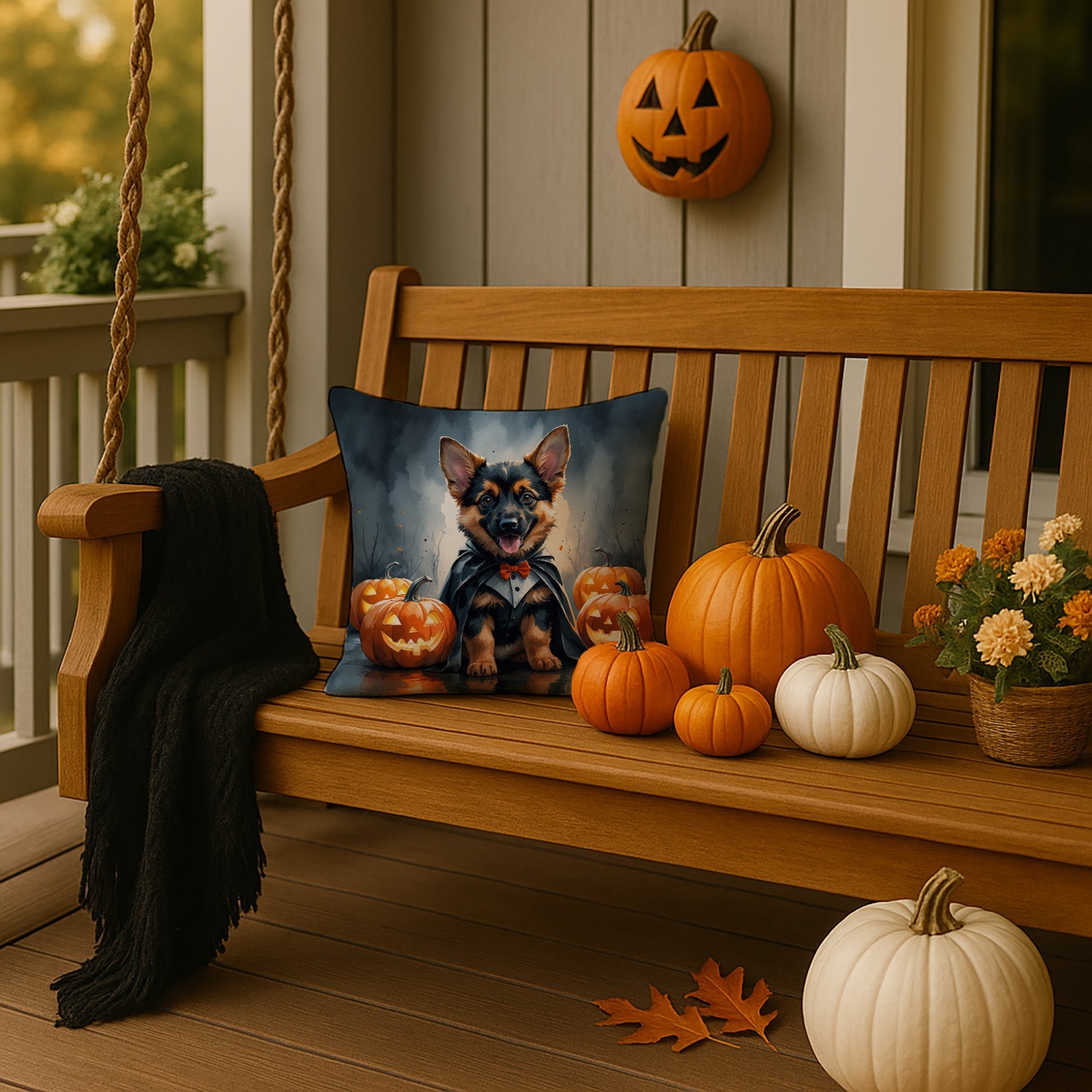 Throw Pillow featuring breed specific German Shepherd artwork. Celebrate Halloween with this Halloween Pillow. Add a touch of vibrancy and comfort to your outdoor seating with Caroline's Treasures Fabric Decorative Pillow. Measuring approximately 14 inches by 14 inches, this outdoor pillow is crafted to elevate the appeal of your patio furniture, infusing it with vivid color and artistic flair. The pillow includes a 100% Polyester Fabric sham filled with a quality pillow form to provide superior comfort. Innovatively made from our brand new material, specifically woven for its water resistance, this pillow is designed for durability. The soft canvas fabric offers versatility in use, fit for your indoor couch or your outdoor patio, porch, or veranda. The fabric is dyed with colorfast dyes built for resilience against weather conditions, ensuring the pillow retains its beauty over time. Constructed by sewing three fabric pieces to create a sham, the polyester insert is then nestled inside to form the pillow, resulting in an overstuffed pillow that maintains its shape. Both the sham and the pillow insert are proudly made in the United States. As the pillows are handcrafted, there may be minor variations in size, further enhancing their unique charm. Experience comfort in style with Caroline's Treasures Fabric Decorative Pillow.