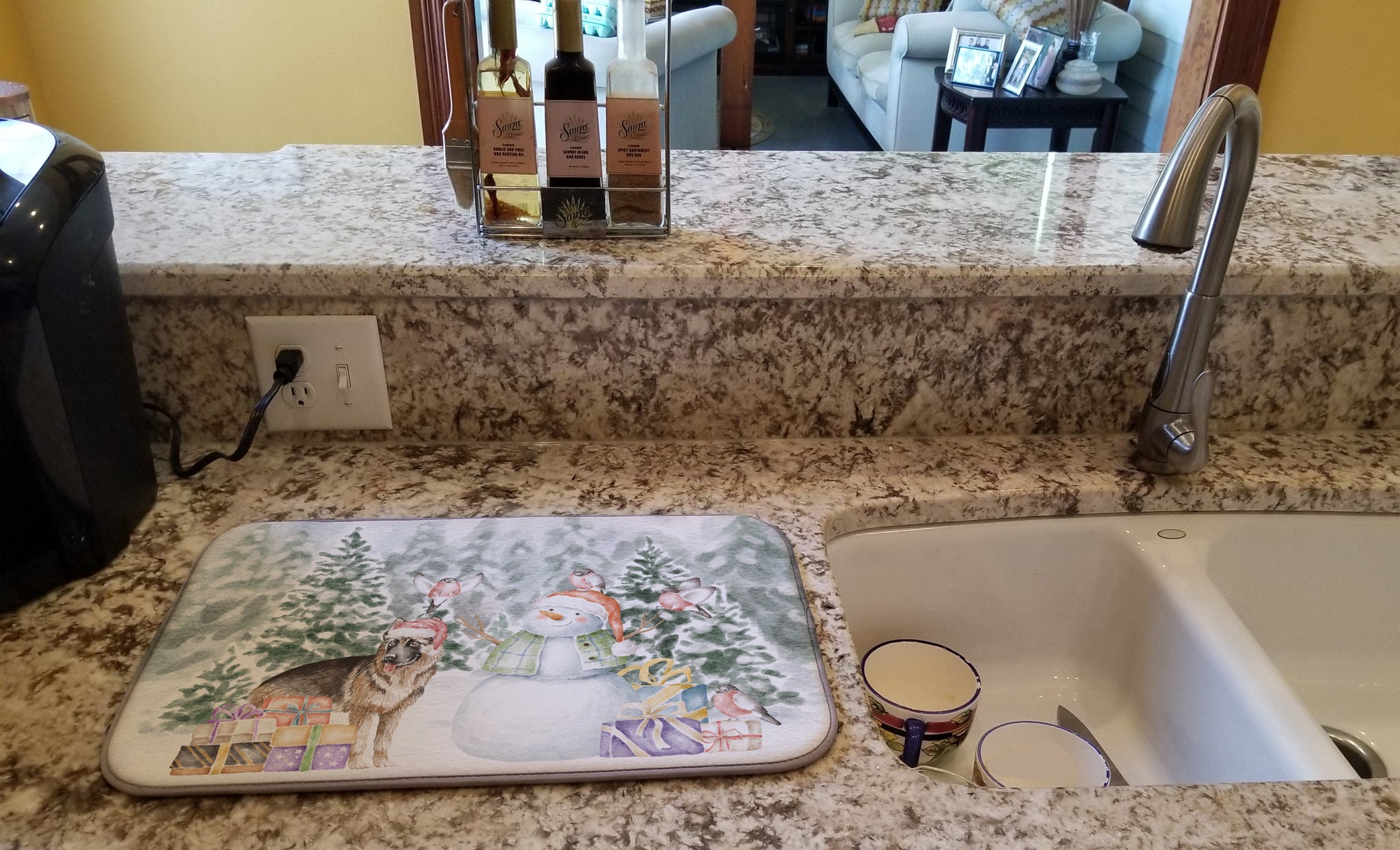 Decorate your space with our Christmas German Shepherd artwork on a Dish Drying Mat. Say goodbye to messy countertops and soggy dish towels with our innovative dish drying mat. Our high-quality dish drying pad is designed to keep your countertops dry while offering a stylish and efficient solution. Whether you're air drying dishes, glasses, stemware, silverware, pots, pans, bottles, or even fruits and vegetables, our dish mat is the perfect choice. The 14 inches x 22 inches size fits most counters and dish drying racks, and the non-slip design ensures stability. Made with water-absorbent polyester and a polyurethane foam insert, our dish drying mat is not only functional but also durable. It's machine washable and printed in the USA for long-lasting use. The beautiful artwork adds flair to your kitchen decor, making it a perfect housewarming gift or present for any occasion. Upgrade your kitchen experience with our absorbent and versatile dish drying mat.