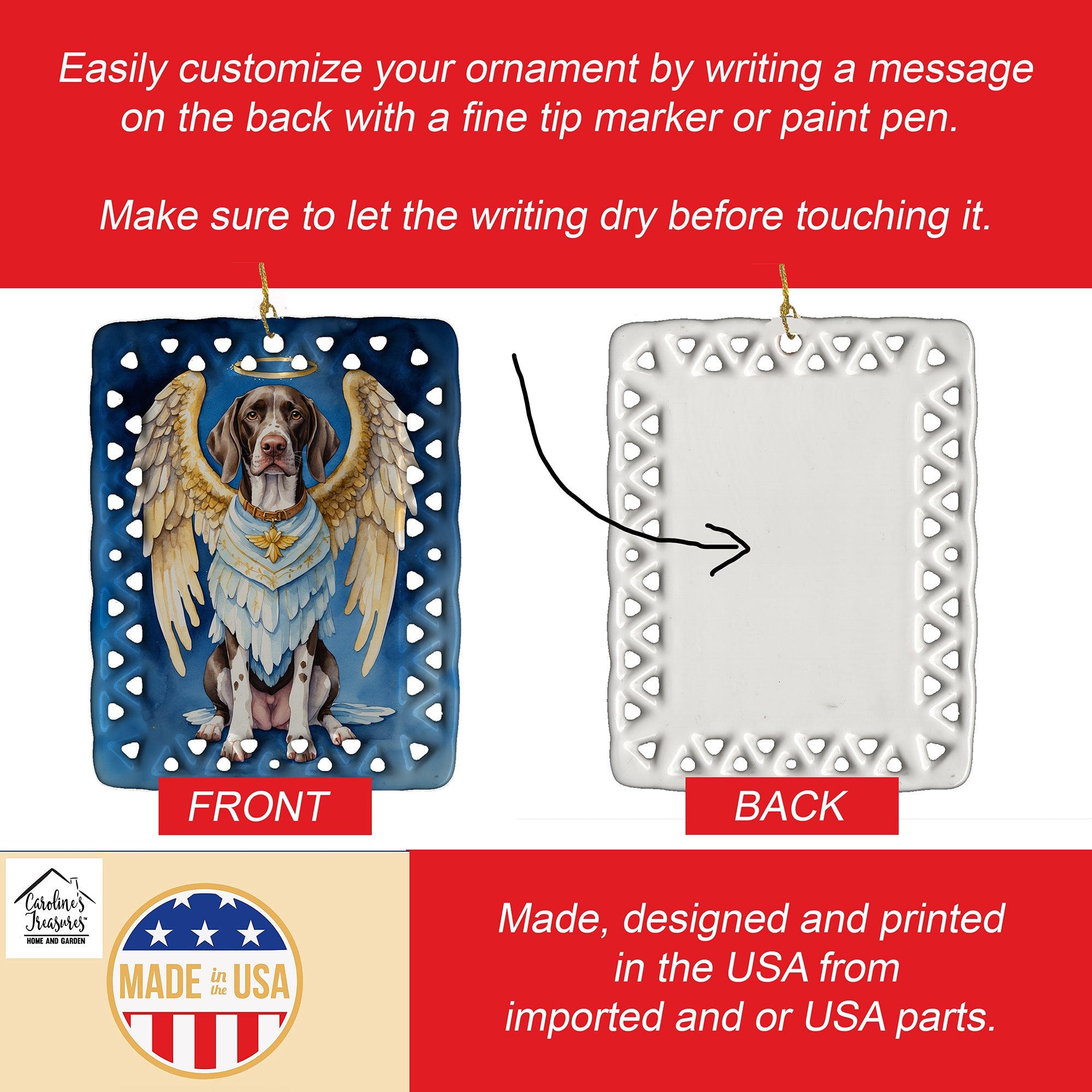 Porcelain Ornament featuring breed specific German Shorthaired Pointer artwork. Celebrate Christmas with this Christmas Ornament. Add a unique, personal touch to your holiday decor with our Rectangular Lattice Porcelain Ornament. Perfect for creating cherished memories, this high-quality ornament shines under festive lights, reflecting warmth and joy throughout your Christmas tree. Crafted with a glossy finish, it showcases vibrant, full-color artwork contributed by our talented artists, ensuring your tree is adorned with a burst of color and holiday spirit. What sets this Porcelain Ornament apart is its customizable white back. Use a paint pen or permanent marker to write a heartfelt message, commemorate a special year, or mark an unforgettable date, turning this ornament into a keepsake that will be treasured for years to come. For best results, allow any personalization to dry thoroughly before handling. Each ornament comes complete with a delicate gold cord, making it easy to hang and display. Proudly made in the USA, this ornament measures 3.375 x 2.625 inches and is a thoughtful gift for pet sitters, teachers, family members, or anyone who would appreciate a little extra holiday magic. Bring style, charm, and a touch of personal meaning to your Christmas tree with this beautifully designed ornament..