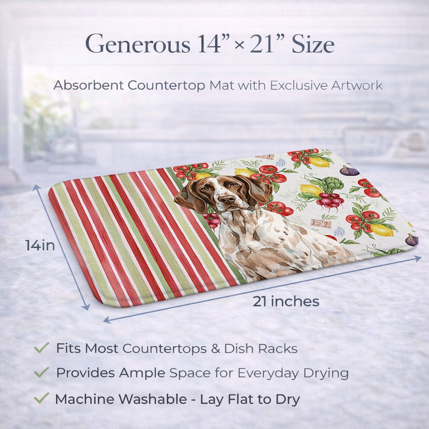 Shown here is the German Shorthaired Pointer Vegetables Dish Drying Mat from Caroline's Treasures featuring artwork of a German Shorthaired Pointer in a Everyday design. The detailed illustration and vibrant colors make it a standout accent that celebrates both seasonal style and love for the subject. This image features a vibrant watercolor vegetable pattern with tomatoes, lemons, artichokes, figs, radishes, and leafy greens arranged in a repeating design, paired with classic red and green stripes. The bright, garden-fresh palette creates a cheerful, farmhouse-inspired look that feels lively, welcoming, and perfect for kitchen décor. Everyday décor celebrates personal style and the small moments that make a house feel like home. Thoughtful designs add warmth and personality that can be enjoyed year-round. Say goodbye to messy countertops and soggy dish towels with our innovative dish drying mat. Our high-quality dish drying pad is designed to keep your countertops dry while offering a stylish and efficient solution. Whether you're air drying dishes, glasses, stemware, silverware, pots, pans, bottles, or even fruits and vegetables, our dish mat is the perfect choice. The 14 inches x 21 inches size fits most counters and dish drying racks, and the non-slip design ensures stability. Made with water-absorbent polyester and a polyurethane foam insert, our dish drying mat is not only functional but also durable. It's machine washable and printed in the USA for long-lasting use. The beautiful artwork adds flair to your kitchen decor, making it a perfect housewarming gift or present for any occasion. Upgrade your kitchen experience with our absorbent and versatile dish drying mat. Perfect for: Kitchen counters and sinks, everyday dish drying and countertop protection, Dogs-themed homes, or year-round use for German Shorthaired Pointer lovers. German Shorthaired Pointers are athletic sporting dogs known for their intelligence and endurance. This versatile breed is admired for its versatility, loyalty, and strong hunting instincts. Makes a heartfelt gift for: German Shorthaired Pointer owners, Dogs lovers, Everyday gifts, pet parents, friends who adore their German Shorthaired Pointer, or anyone celebrating Dogs.
