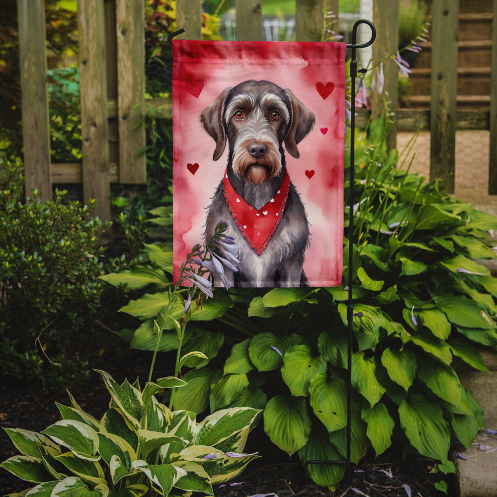 Decorate your space with our Valentine's Day German Wirehaired Pointer artwork on a Garden Flag. Enhance the beauty of your garden, patio, or yard with Caroline's Treasures Decorative Garden Flag, proudly made in the USA. Crafted from two pieces of thick, double-sided polyester fabric, this 2-ply garden flag is designed to withstand various weather conditions, making it water-resistant and weatherproof. Featuring correctly readable words on both sides, this garden flag offers a delightful visual experience from any angle. With its heavier weight, it stands out among other garden flags, ensuring stability and durability even in wind, rain, and snow. Measuring approximately 11 1/4 inches by 15 1/2 inches, this flag allows you to personalize your outdoor decor. It comes with a 1 1/2-inch sleeve sewn in, allowing easy attachment to any standard garden flag stand or garden size porch hanger (sold separately). Make a statement in your outdoor space with Caroline's Treasures Decorative Garden Flag, a vibrant and high-quality flag that adds color and personality to your surroundings. Proudly made in the USA, it's a symbol of quality craftsmanship and attention to detail.