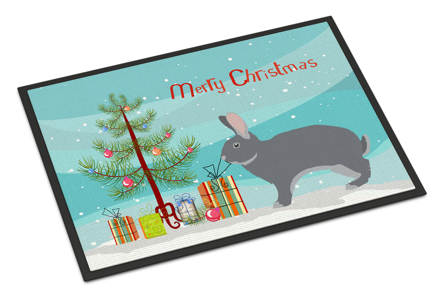 Decorate your space with our Christmas Giant Chinchilla Rabbit artwork on a Doormat. Welcome your guests in style with our Artwork Door Mat, designed to withstand almost any weather condition. This mat, measuring approximately 18 by 27 inches, is held together by durable black binding tape. Its top layer, composed of polyester felt, is dyed with the eye-catching image you see on the mat. A few layers below provide the mat with stability, while its rubber bottom is stamped to help prevent slipping and ensures safety. Our mat works wonderfully as both an indoor or outdoor door mat. For cleaning, simply hose it off with water or use a power washer - no need for any cleaner that produces suds. Avoid scrubbing with a brush, instead, opt for the vacuum on floor setting. Designed manufactured and printed in the USA, this mat is a perfect addition to your porch, outdoor kitchen, entryway, or any indoor space. Its unique design makes it a charming decorative rug that greets your guests and adds a stylish touch to your home decor.