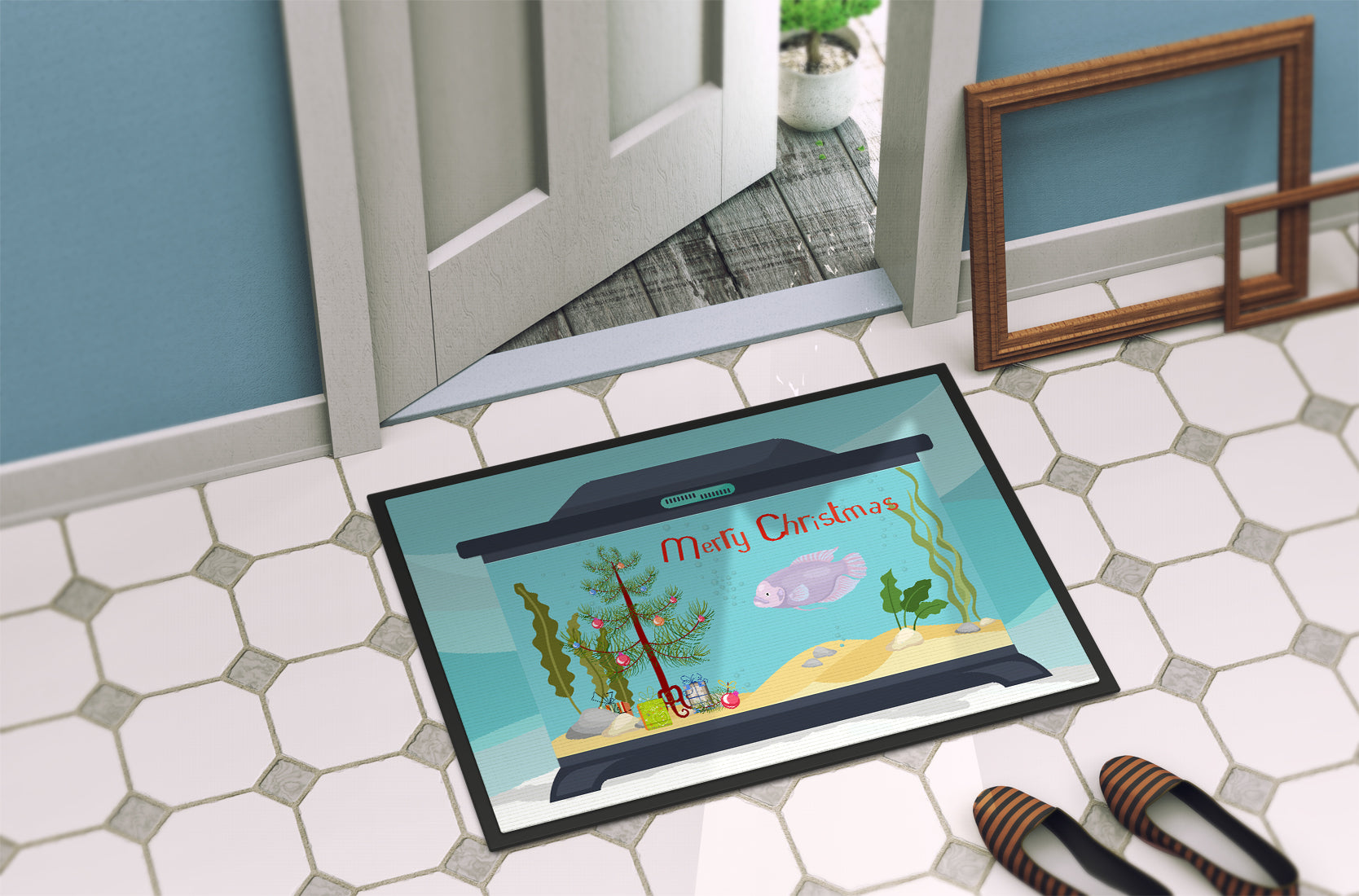 Decorate your space with our Christmas Giant Gourami artwork on a Doormat. Welcome your guests in style with our Artwork Door Mat, designed to withstand almost any weather condition. This mat, measuring approximately 24 by 36 inches, is held together by durable black binding tape. Its top layer, composed of polyester felt, is dyed with the eye-catching image you see on the mat. A few layers below provide the mat with stability, while its rubber bottom is stamped to help prevent slipping and ensures safety. Our mat works wonderfully as both an indoor or outdoor door mat. For cleaning, simply hose it off with water or use a power washer - no need for any cleaner that produces suds. Avoid scrubbing with a brush, instead, opt for the vacuum on floor setting. Designed manufactured and printed in the USA, this mat is a perfect addition to your porch, outdoor kitchen, entryway, or any indoor space. Its unique design makes it a charming decorative rug that greets your guests and adds a stylish touch to your home decor.