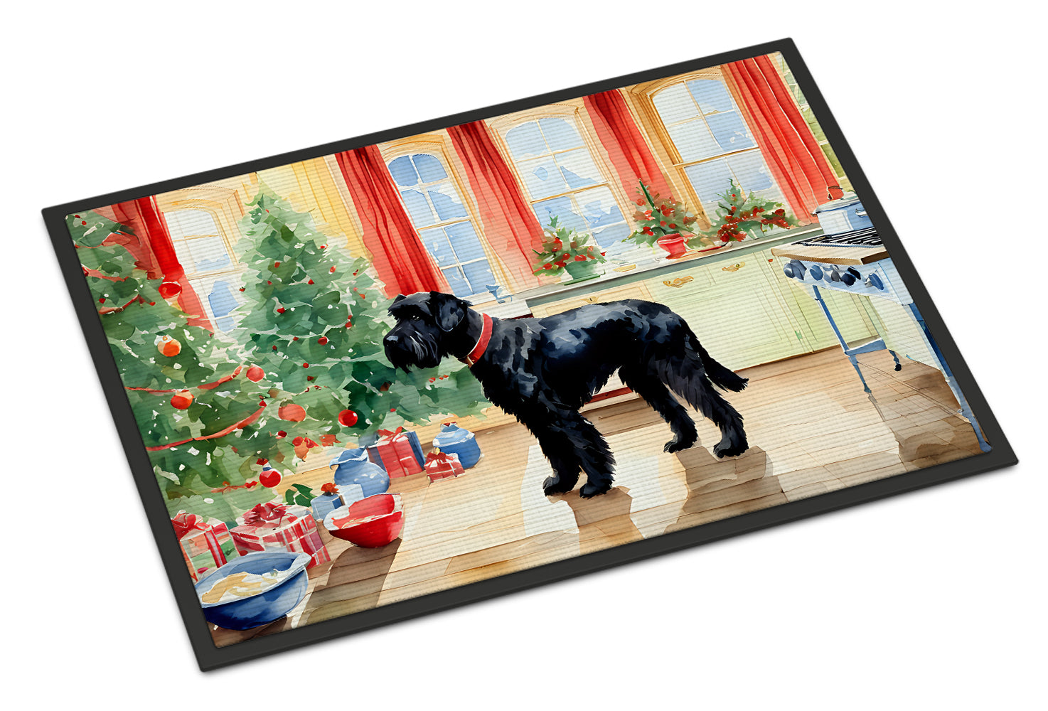 Decorate your space with our Christmas Giant Schnauzer artwork on a Doormat. Welcome your guests in style with our Artwork Door Mat, designed to withstand almost any weather condition. This mat, measuring approximately 18 by 27 inches, is held together by durable black binding tape. Its top layer, composed of polyester felt, is dyed with the eye-catching image you see on the mat. A few layers below provide the mat with stability, while its rubber bottom is stamped to help prevent slipping and ensures safety. Our mat works wonderfully as both an indoor or outdoor door mat. For cleaning, simply hose it off with water or use a power washer - no need for any cleaner that produces suds. Avoid scrubbing with a brush, instead, opt for the vacuum on floor setting. Designed manufactured and printed in the USA, this mat is a perfect addition to your porch, outdoor kitchen, entryway, or any indoor space. Its unique design makes it a charming decorative rug that greets your guests and adds a stylish touch to your home decor.