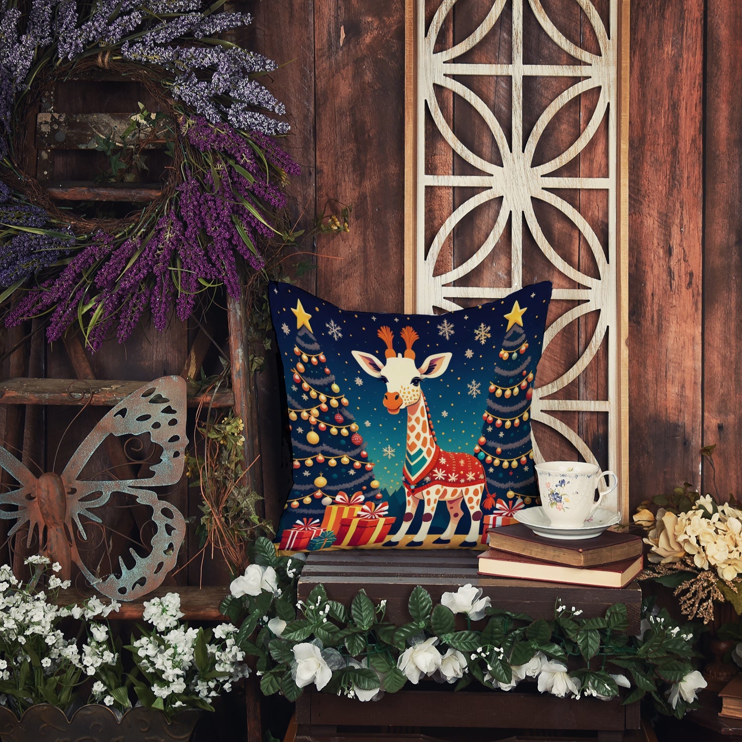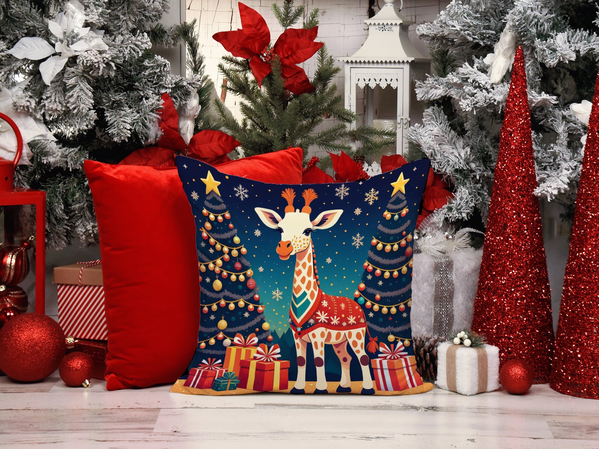 Decorate your space with our Christmas Giraffe artwork on a Pillow. Revitalize your outdoor or indoor living space with Caroline's Treasures 18x18 Fabric Decorative Pillow. With a generously sized dimension of approximately 18 inches by 18 inches, this pillow makes a comfortable and aesthetic addition to any seating area. Made from a unique, water-resistant material developed by Caroline's Treasures, the pillow sham is 100% polyester fabric that's durable and ready to weather any condition. Its vibrant, full-color artwork will not fade over time as it is dyed with color-fast dyes. Whether you place it on your patio furniture, porch, veranda, or indoor couch, its soft canvas fabric ensures a cozy experience. The pillow is handcrafted in the United States, featuring a sham created from three pieces of fabric and a polyester insert for enduring shape and overstuffed comfort. Despite being robustly built to endure the outdoors, it is as soft and snug as your favorite indoor cushions. Please note, as all our pillows are handmade, sizes may vary slightly, adding to the charm of this unique decorative item.