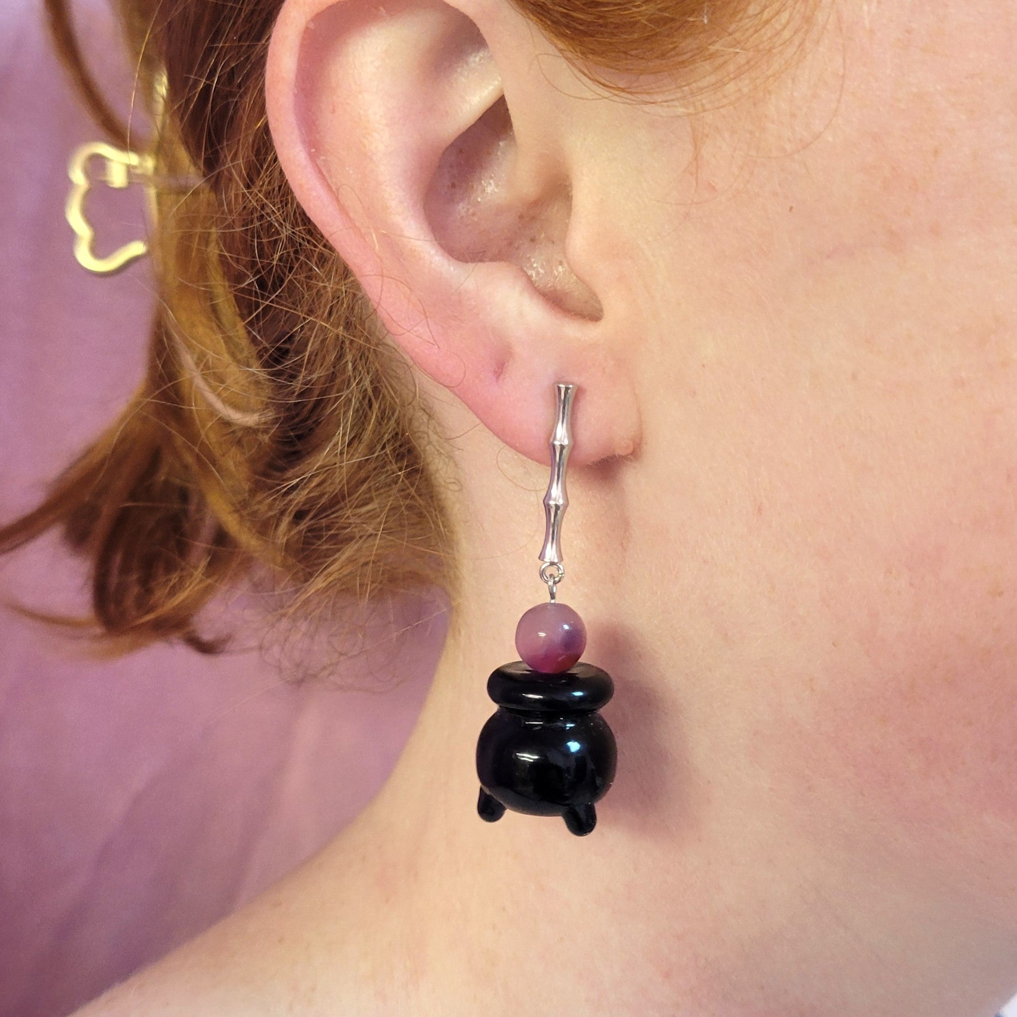 Stir up some fun with these Glass Beaded Bubbling Cauldron Earrings! Each earring features a charming glass-blown cauldron topped with a marbled purple bead that captures the smoky, bubbling potion vibe. Lightweight and playful, they’re perfect for adding a whimsical touch to any outfit.