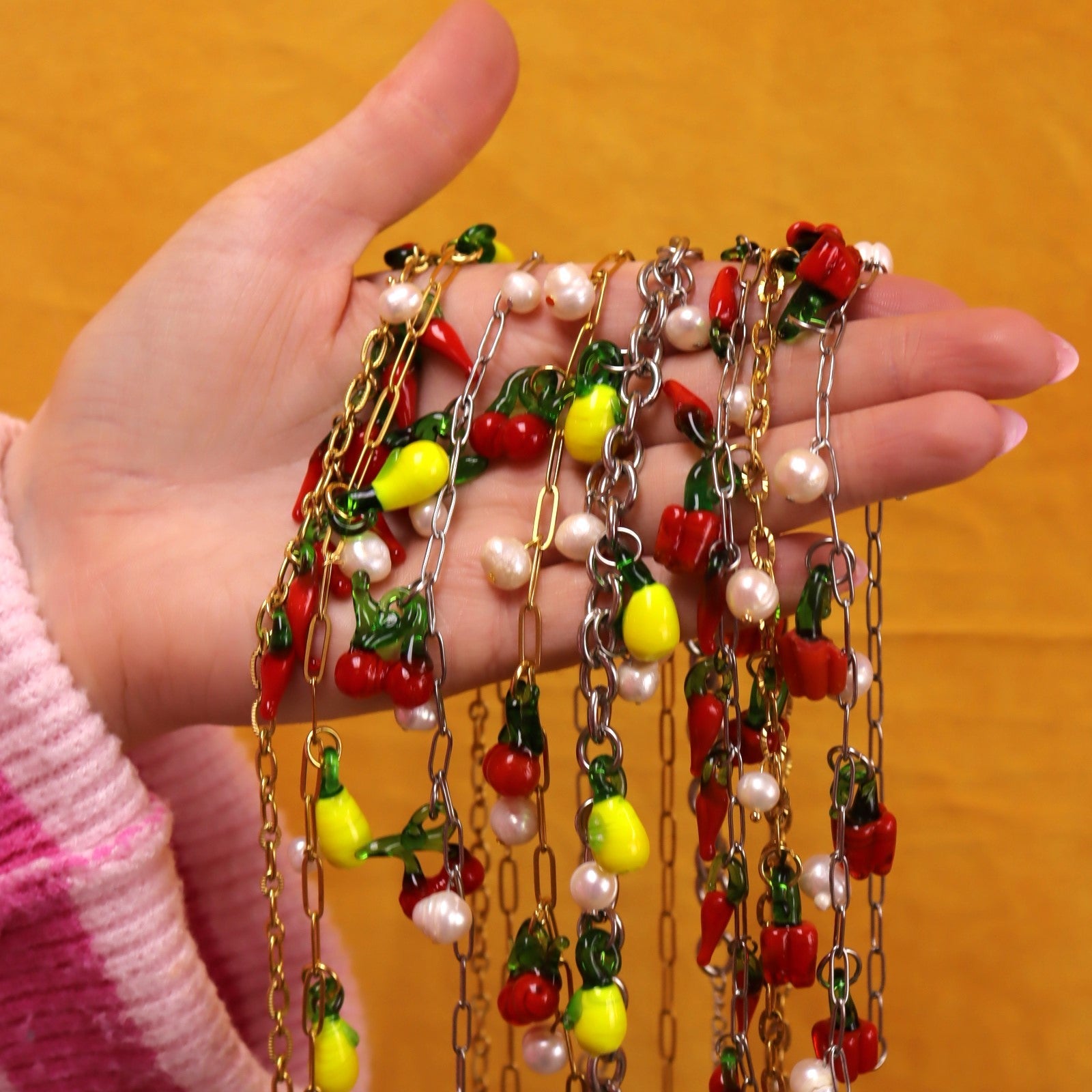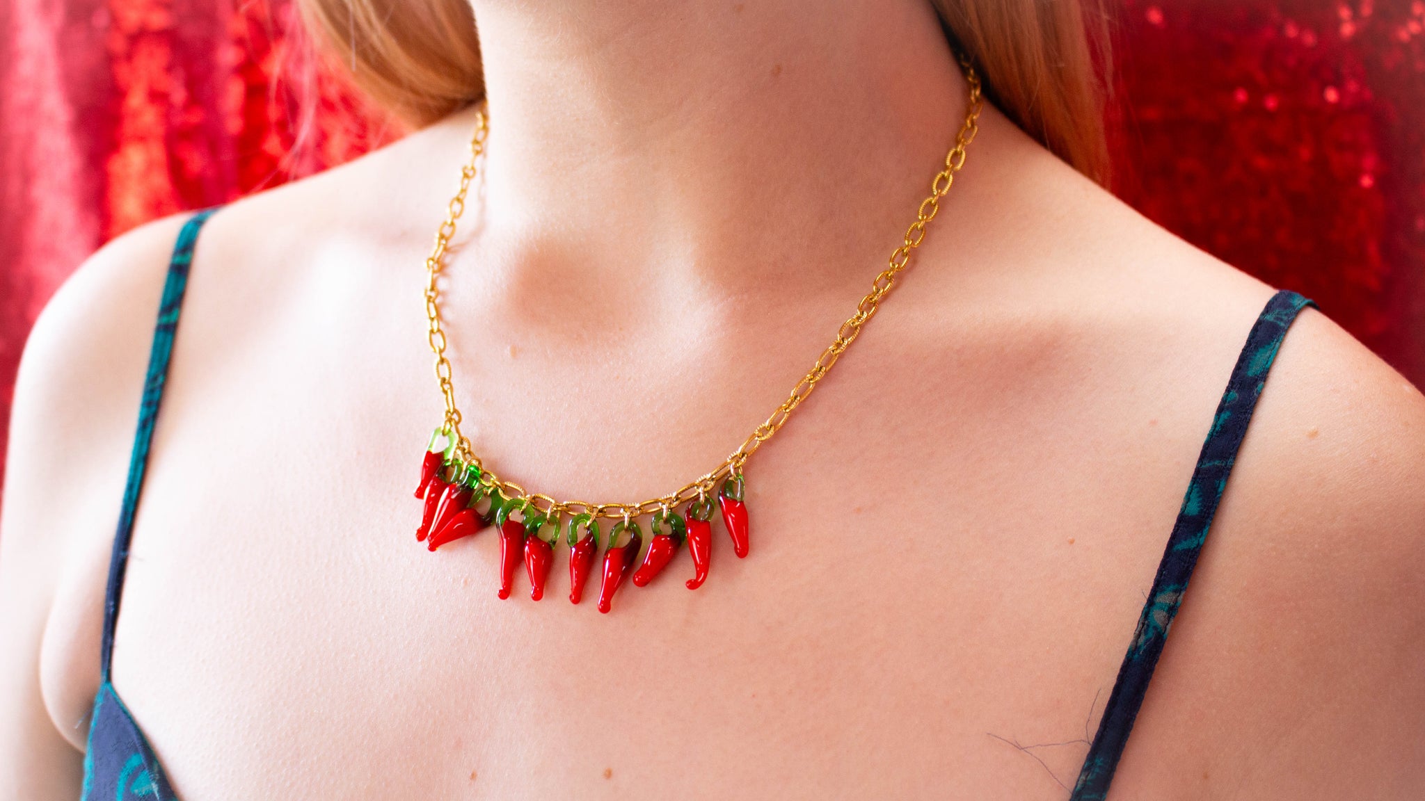 Indulge in fiery fashion with our Glass Beaded Chili Pepper Necklace! The adjustable, high-quality chain is adorned with charming, handmade glass red chili peppers, adding a pop of bold color to any outfit. Spice up your style and stand out from the crowd with this unique and eye-catching necklace!