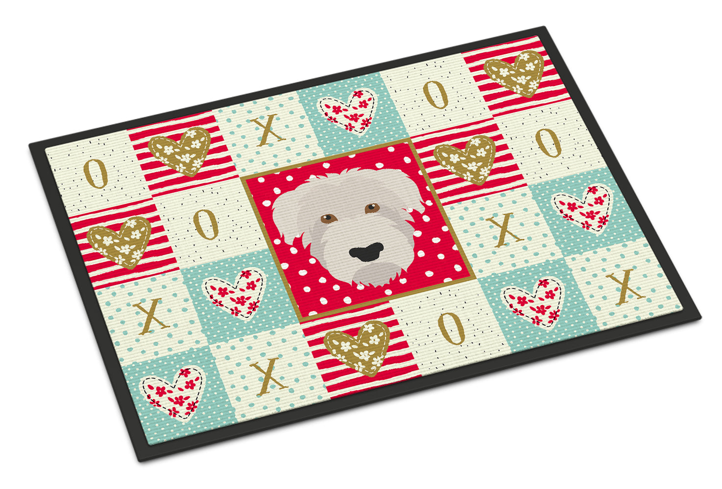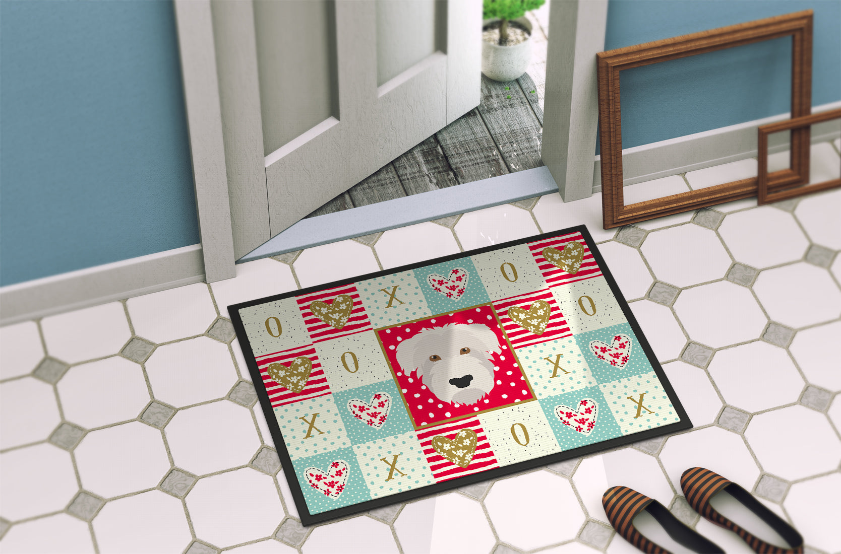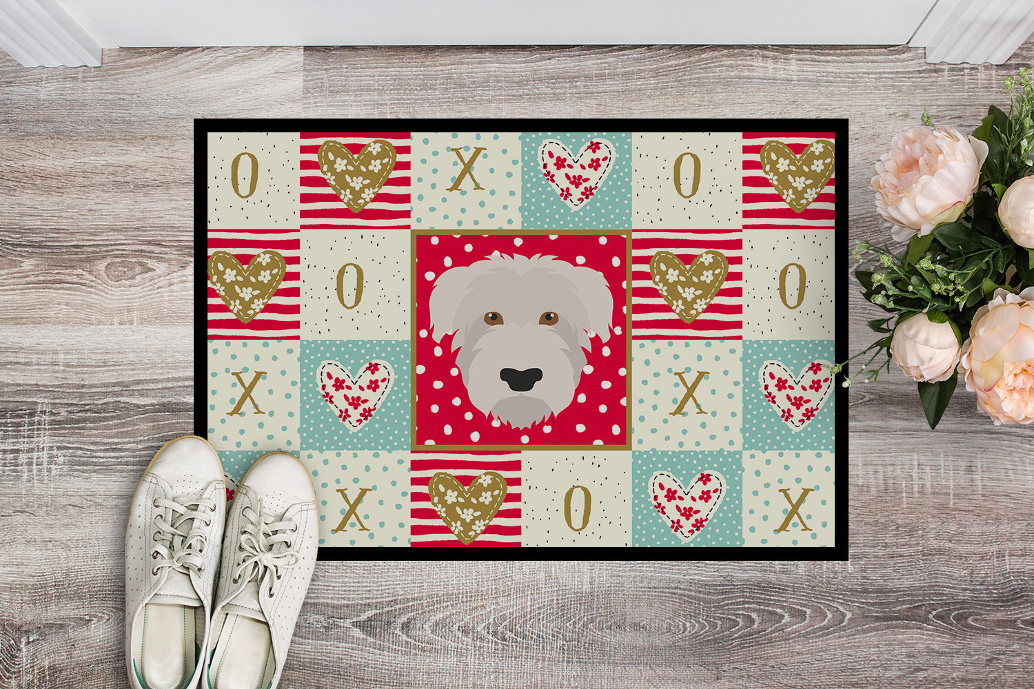 Decorate your space with our Valentine's Day Glen of Imaal artwork on a Doormat. Welcome your guests in style with our Artwork Door Mat, designed to withstand almost any weather condition. This mat, measuring approximately 18 by 27 inches, is held together by durable black binding tape. Its top layer, composed of polyester felt, is dyed with the eye-catching image you see on the mat. A few layers below provide the mat with stability, while its rubber bottom is stamped to help prevent slipping and ensures safety. Our mat works wonderfully as both an indoor or outdoor door mat. For cleaning, simply hose it off with water or use a power washer - no need for any cleaner that produces suds. Avoid scrubbing with a brush, instead, opt for the vacuum on floor setting. Designed manufactured and printed in the USA, this mat is a perfect addition to your porch, outdoor kitchen, entryway, or any indoor space. Its unique design makes it a charming decorative rug that greets your guests and adds a stylish touch to your home decor.