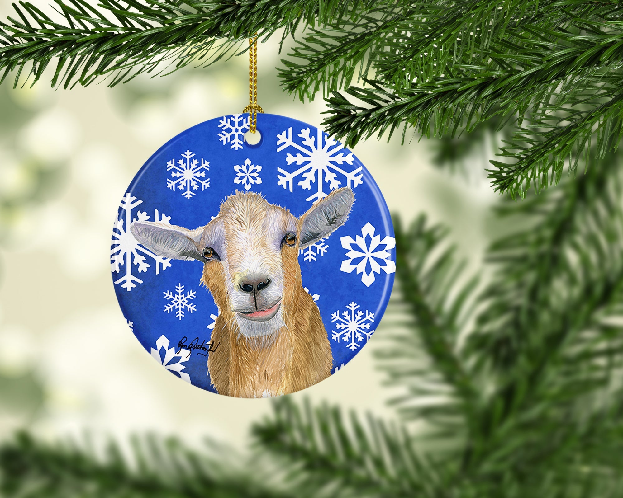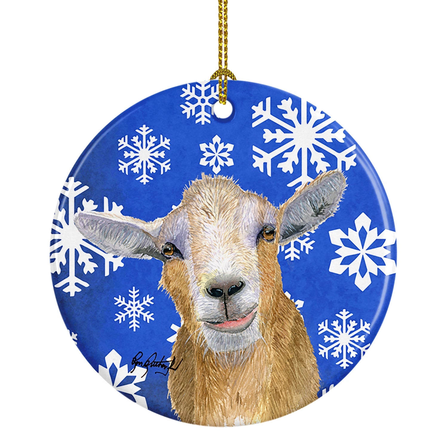 Decorate your space with our Christmas Goat artwork on a Ornament. Bring a bit of Winter into your home with a Winter Ornament. Add a touch of personalized charm to your Christmas tree this holiday season with our Ceramic Ornament. Measuring 2.8125 inches in diameter, this round porcelain ornament beautifully reflects your festive lights, enhancing your holiday decor. The gloss surface sets off the vibrant, full-color artwork contributed by one of our talented artists, bringing a pop of color and joy to your tree. This Ceramic Ornament doesn't stop at being merely decorative. The white back is designed for personalization. Write a heartfelt message, mark a special year, or inscribe a date with a paint pen or a permanent marker to create a treasured memento. Please ensure you allow any personalization to dry thoroughly before handling to maintain the pristine finish. Included with the ornament is a delicate gold cord for easy hanging. Made in the USA, this Ceramic Ornament makes an exceptional gift for a pet sitter, teacher, family member, or anyone you wish to share a little Christmas magic with. With its blend of style, charm, and personal touch, it's a meaningful addition to any Christmas tree.