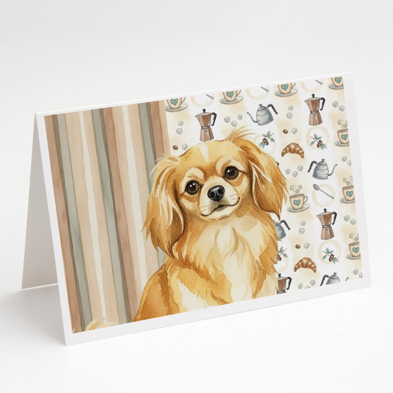 Shown here is the Gold Tibetan Spaniel Coffee Bar Greeting Cards Pack of 8 from Caroline's Treasures featuring artwork of a Tibetan Spaniel in a Everyday design. The detailed illustration and vibrant colors make it a standout accent that celebrates both seasonal style and love for the subject. This image features a cozy watercolor coffee-themed pattern with illustrated mugs, moka pots, kettles, croissants, coffee beans, and sugar cubes arranged in a repeating design. Soft neutral tones with warm browns, creams, and subtle sage accents create an inviting, café-inspired look that feels comforting and relaxed. Everyday décor celebrates personal style and the small moments that make a house feel like home. Thoughtful designs add warmth and personality that can be enjoyed year-round. Celebrate special moments with Caroline's Treasures Printed Greeting Card Pack. This pack includes eight beautifully folded 5x7 cards, accompanied by eight matching white envelopes. With blank interiors, these cards provide ample space for your personalized messages and heartfelt holiday greetings. Each card features captivating full-color artwork, meticulously printed in our facility on high-quality 80 lb cover stock or 216 GSM. The super smooth finish of the white cards enhances the visual impact of the artwork, creating a truly stunning presentation. Designed by our talented in-house artists or licensed artists, the artwork on these cards showcases their creativity and attention to detail. From vibrant illustrations to captivating designs, each card tells its own unique story. Whether it's for birthdays, anniversaries, holidays, or any special occasion, Caroline's Treasures Greeting Card Pack is the perfect way to convey your heartfelt sentiments. Share joy, love, and warm wishes with these exquisite cards and make every moment unforgettable. Perfect for: Writing personal messages, everyday correspondence, and thoughtful notes, Dogs-themed stationery collections, or year-round use for Tibetan Spaniel lovers. Tibetan Spaniels are small companion dogs known for their intelligence and alert nature. This breed is cherished for its loyalty, independence, and affectionate personality. Makes a heartfelt gift for: Tibetan Spaniel owners, Dogs lovers, Everyday gifts, pet parents, friends who adore their Tibetan Spaniel, or anyone celebrating Dogs.