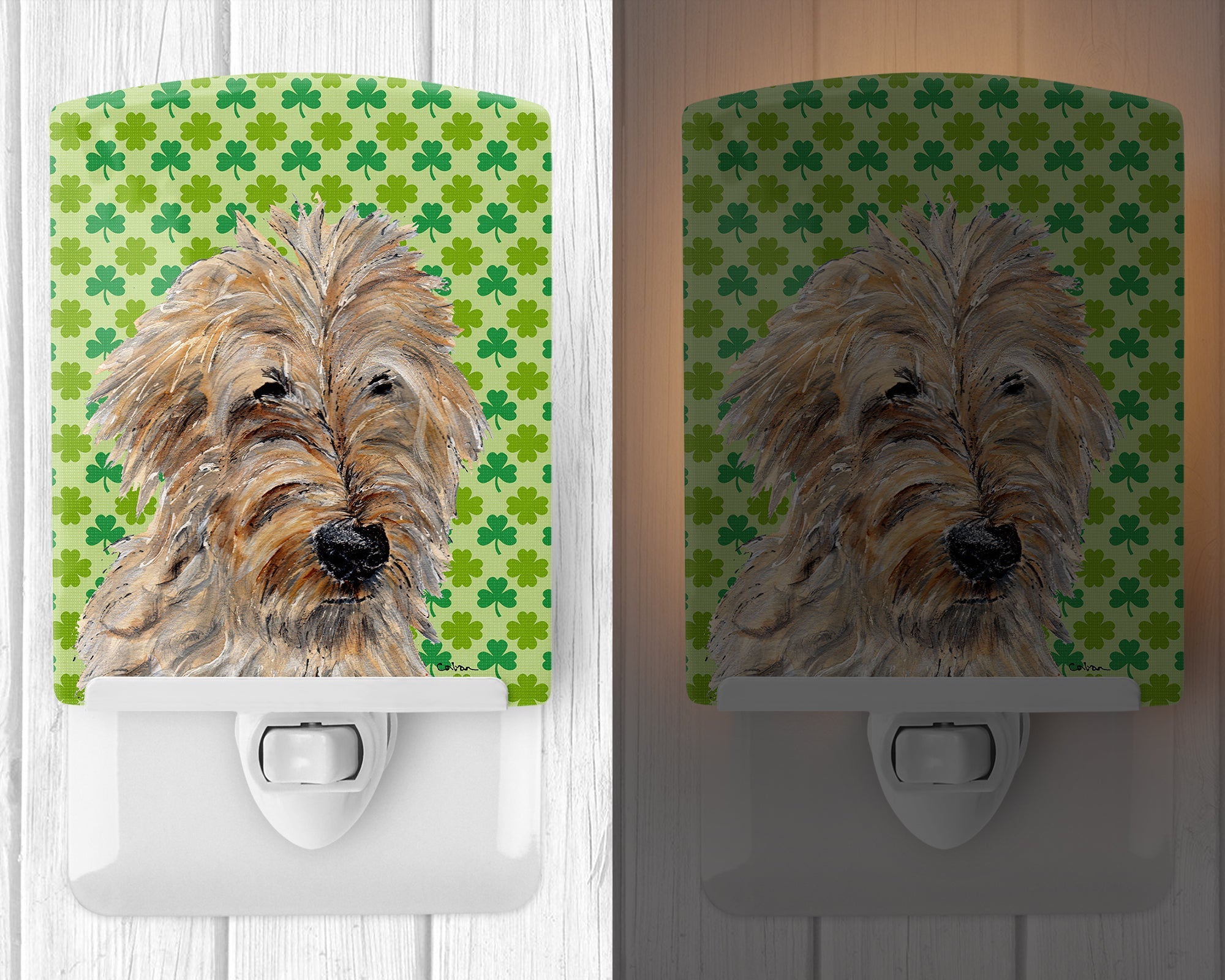Decorate your space with our St Patrick's Day Goldendoodle artwork on a Night Light. Introduce a splash of artistic flair and subtle illumination to your space with the Decorative Ceramic Night Light from Caroline's Treasures. Perfect for any room, this night light seamlessly blends functionality with an aesthetic appeal, offering a stylish solution to brighten up dark corners of your home or office. Boasting a six-inch high by four-inch wide ceramic tile at the front, it showcases vivid, full-color artwork from distinguished artists, transforming a simple utility into a vibrant art piece. The artwork is securely encased in a robust metal holder, ensuring durability and longevity. Two screws are provided to firmly affix the tile into the holder. The holder extends three inches deep, housing an included bulb that emits a soft, welcoming glow. This product meets all safety standards, as evidenced by its UL approval. Proudly made in the United States from imported components, this Decorative Ceramic Night Light is not just a functional device; it's a statement piece that enhances the ambiance of your surroundings.