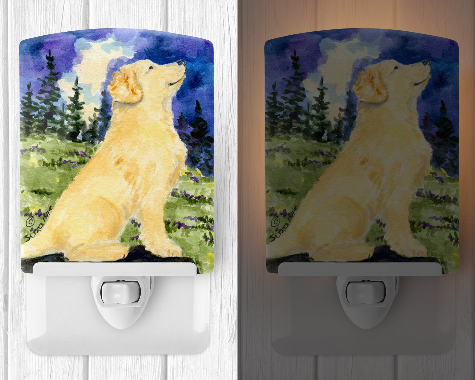 Decorate your space with our Golden Retriever artwork on a Night Light. Introduce a splash of artistic flair and subtle illumination to your space with the Decorative Ceramic Night Light from Caroline's Treasures. Perfect for any room, this night light seamlessly blends functionality with an aesthetic appeal, offering a stylish solution to brighten up dark corners of your home or office. Boasting a six-inch high by four-inch wide ceramic tile at the front, it showcases vivid, full-color artwork from distinguished artists, transforming a simple utility into a vibrant art piece. The artwork is securely encased in a robust metal holder, ensuring durability and longevity. Two screws are provided to firmly affix the tile into the holder. The holder extends three inches deep, housing an included bulb that emits a soft, welcoming glow. This product meets all safety standards, as evidenced by its UL approval. Proudly made in the United States from imported components, this Decorative Ceramic Night Light is not just a functional device; it's a statement piece that enhances the ambiance of your surroundings.