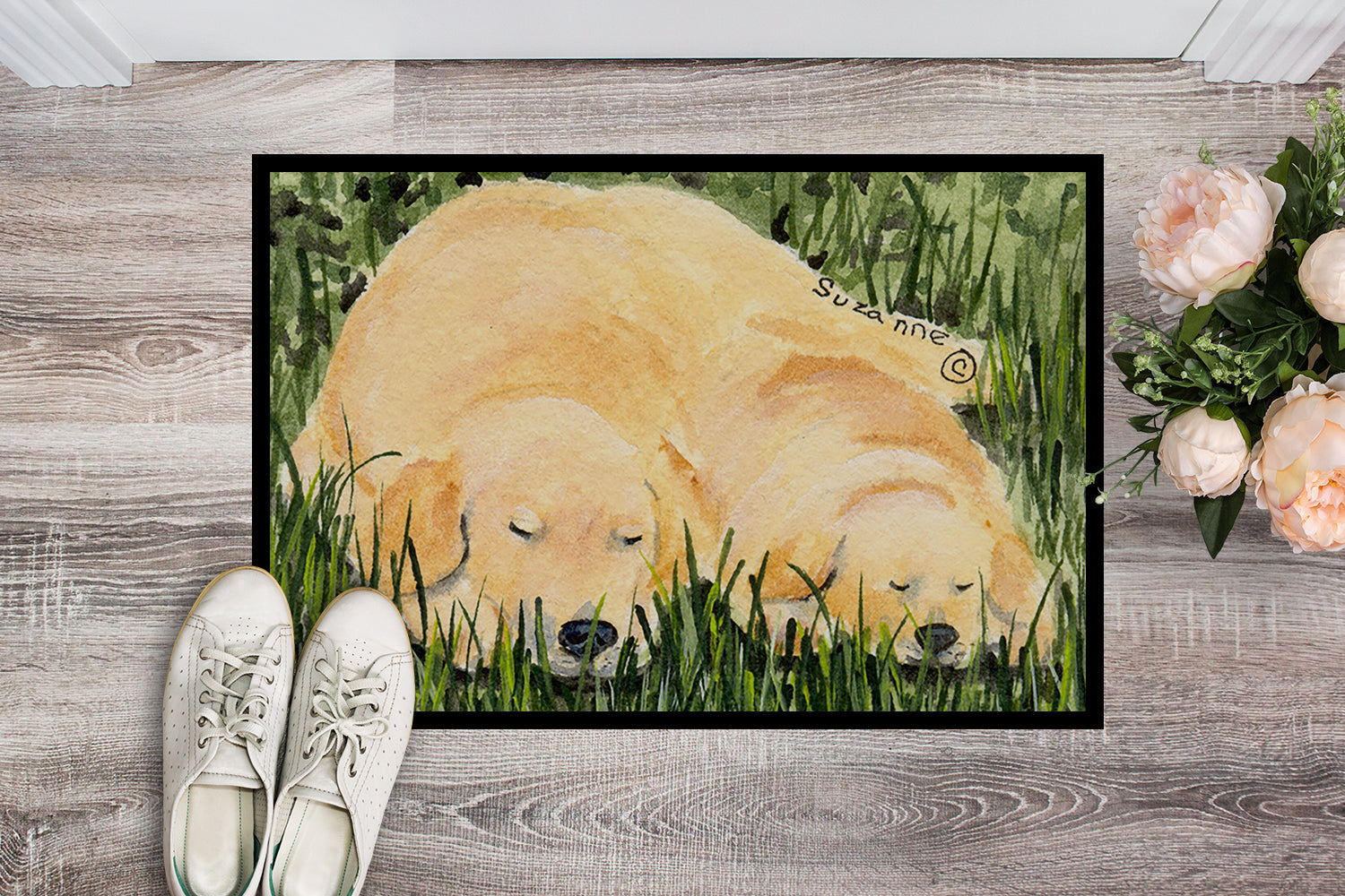 Decorate your space with our Golden Retriever artwork on a Doormat. Welcome your guests in style with our Artwork Door Mat, designed to withstand almost any weather condition. This mat, measuring approximately 24 by 36 inches, is held together by durable black binding tape. Its top layer, composed of polyester felt, is dyed with the eye-catching image you see on the mat. A few layers below provide the mat with stability, while its rubber bottom is stamped to help prevent slipping and ensures safety. Our mat works wonderfully as both an indoor or outdoor door mat. For cleaning, simply hose it off with water or use a power washer - no need for any cleaner that produces suds. Avoid scrubbing with a brush, instead, opt for the vacuum on floor setting. Designed manufactured and printed in the USA, this mat is a perfect addition to your porch, outdoor kitchen, entryway, or any indoor space. Its unique design makes it a charming decorative rug that greets your guests and adds a stylish touch to your home decor.