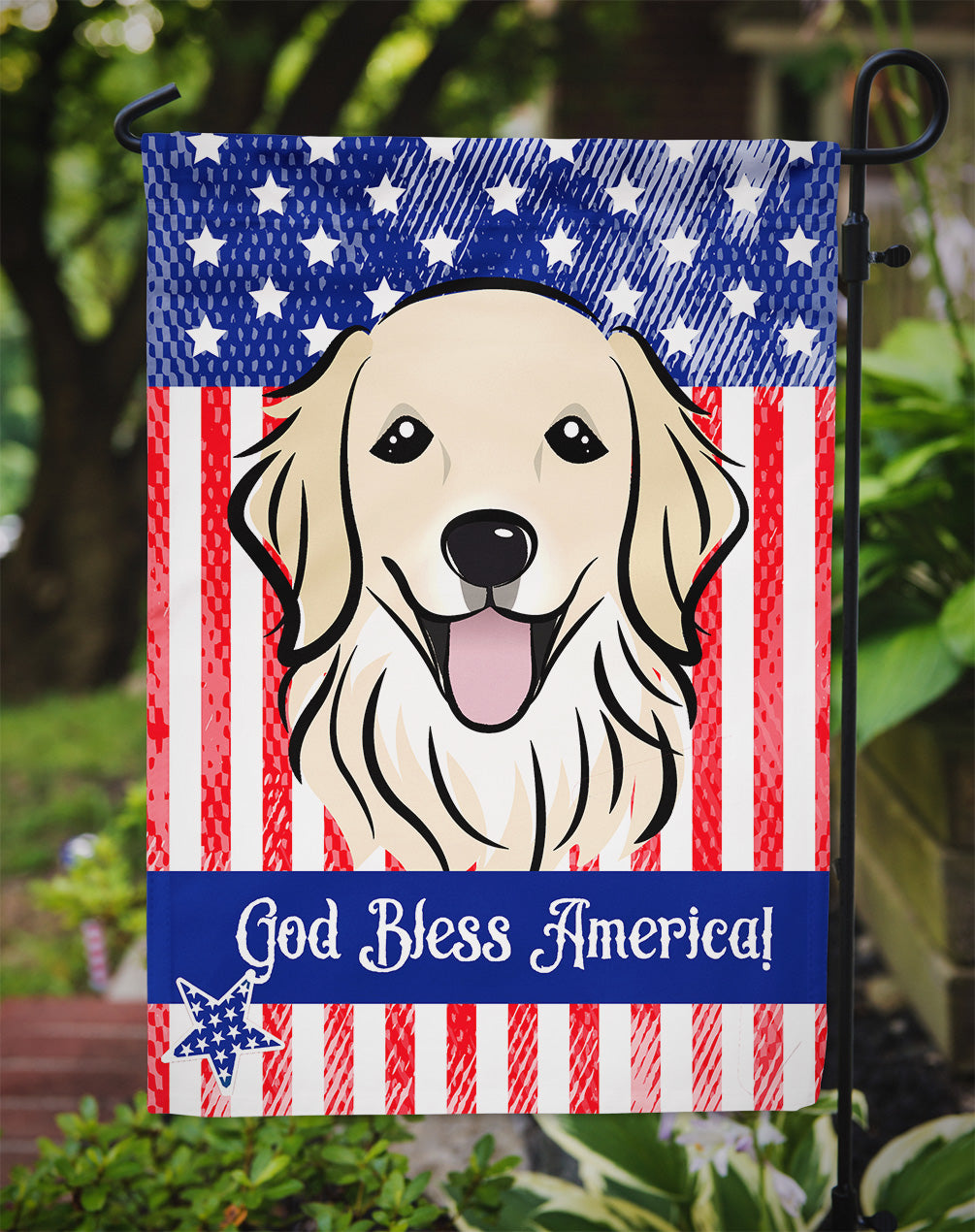 Decorate your space with our Golden Retriever artwork on a Garden Flag. Enhance the beauty of your garden, patio, or yard with Caroline's Treasures Decorative Garden Flag, proudly made in the USA. Crafted from two pieces of thick, double-sided polyester fabric, this 2-ply garden flag is designed to withstand various weather conditions, making it water-resistant and weatherproof. Featuring correctly readable words on both sides, this garden flag offers a delightful visual experience from any angle. With its heavier weight, it stands out among other garden flags, ensuring stability and durability even in wind, rain, and snow. Measuring approximately 11 1/4 inches by 15 1/2 inches, this flag allows you to personalize your outdoor decor. It comes with a 1 1/2-inch sleeve sewn in, allowing easy attachment to any standard garden flag stand or garden size porch hanger (sold separately). Make a statement in your outdoor space with Caroline's Treasures Decorative Garden Flag, a vibrant and high-quality flag that adds color and personality to your surroundings. Proudly made in the USA, it's a symbol of quality craftsmanship and attention to detail.