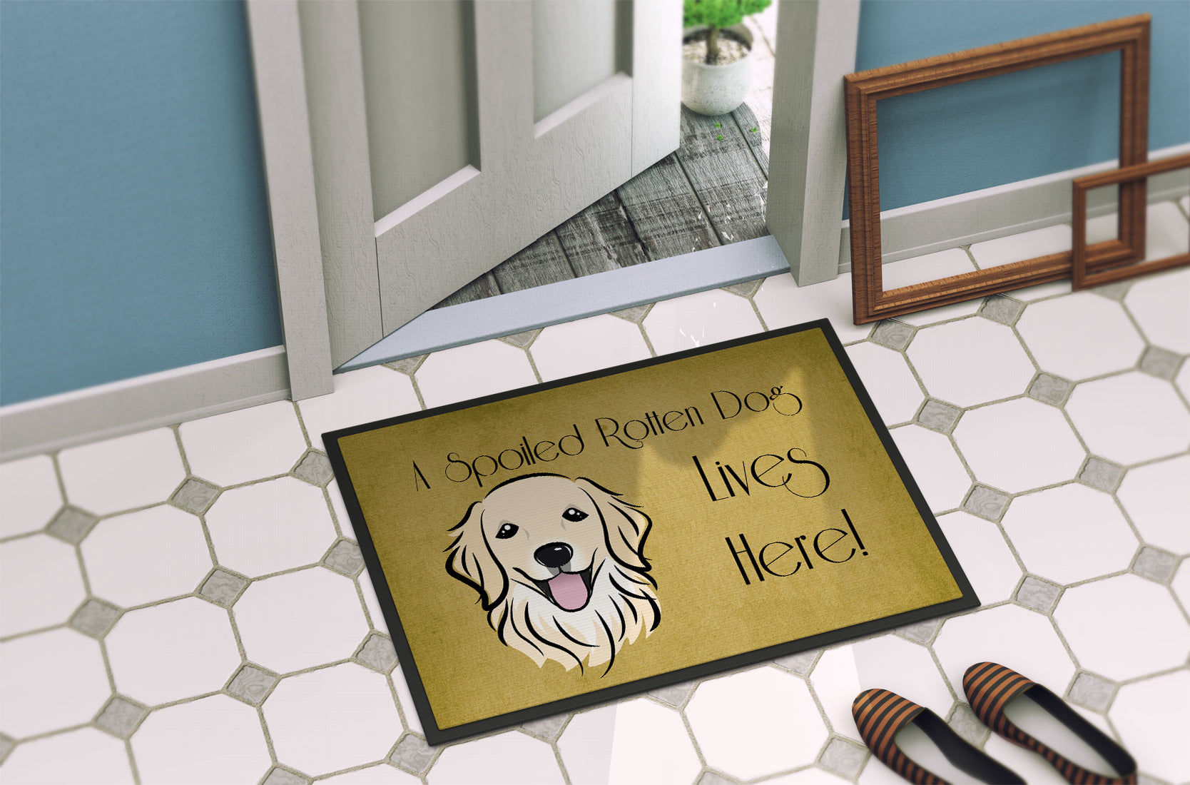 Decorate your space with our Golden Retriever artwork on a Doormat. Welcome your guests in style with our Artwork Door Mat, designed to withstand almost any weather condition. This mat, measuring approximately 24 by 36 inches, is held together by durable black binding tape. Its top layer, composed of polyester felt, is dyed with the eye-catching image you see on the mat. A few layers below provide the mat with stability, while its rubber bottom is stamped to help prevent slipping and ensures safety. Our mat works wonderfully as both an indoor or outdoor door mat. For cleaning, simply hose it off with water or use a power washer - no need for any cleaner that produces suds. Avoid scrubbing with a brush, instead, opt for the vacuum on floor setting. Designed manufactured and printed in the USA, this mat is a perfect addition to your porch, outdoor kitchen, entryway, or any indoor space. Its unique design makes it a charming decorative rug that greets your guests and adds a stylish touch to your home decor.