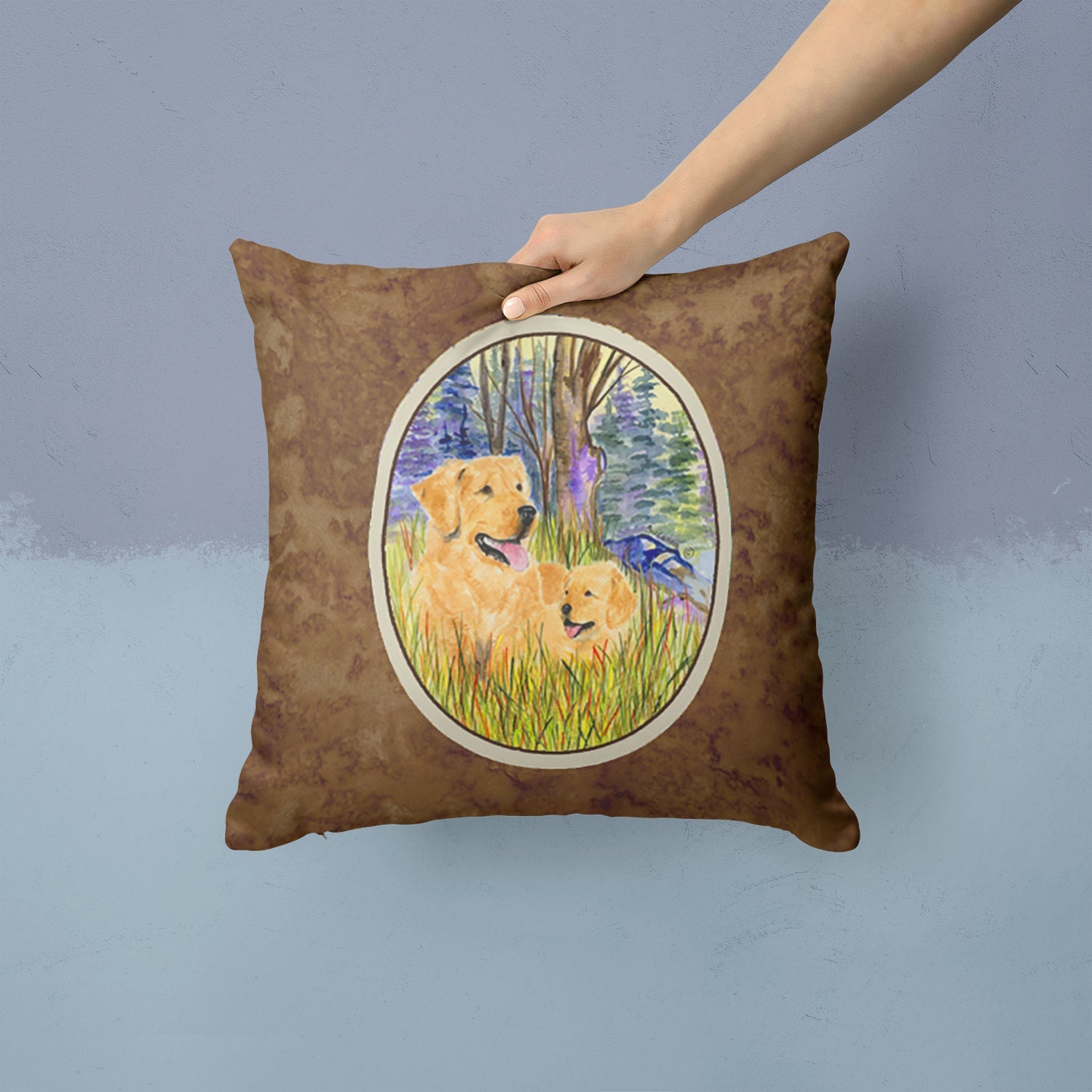Decorate your space with our Golden Retriever artwork on a Pillow. Add a touch of vibrancy and comfort to your outdoor seating with Caroline's Treasures Fabric Decorative Pillow. Measuring approximately 14 inches by 14 inches, this outdoor pillow is crafted to elevate the appeal of your patio furniture, infusing it with vivid color and artistic flair. The pillow includes a 100% Polyester Fabric sham filled with a quality pillow form to provide superior comfort. Innovatively made from our brand new material, specifically woven for its water resistance, this pillow is designed for durability. The soft canvas fabric offers versatility in use, fit for your indoor couch or your outdoor patio, porch, or veranda. The fabric is dyed with colorfast dyes built for resilience against weather conditions, ensuring the pillow retains its beauty over time. Constructed by sewing three fabric pieces to create a sham, the polyester insert is then nestled inside to form the pillow, resulting in an overstuffed pillow that maintains its shape. Both the sham and the pillow insert are proudly made in the United States. As the pillows are handcrafted, there may be minor variations in size, further enhancing their unique charm. Experience comfort in style with Caroline's Treasures Fabric Decorative Pillow.