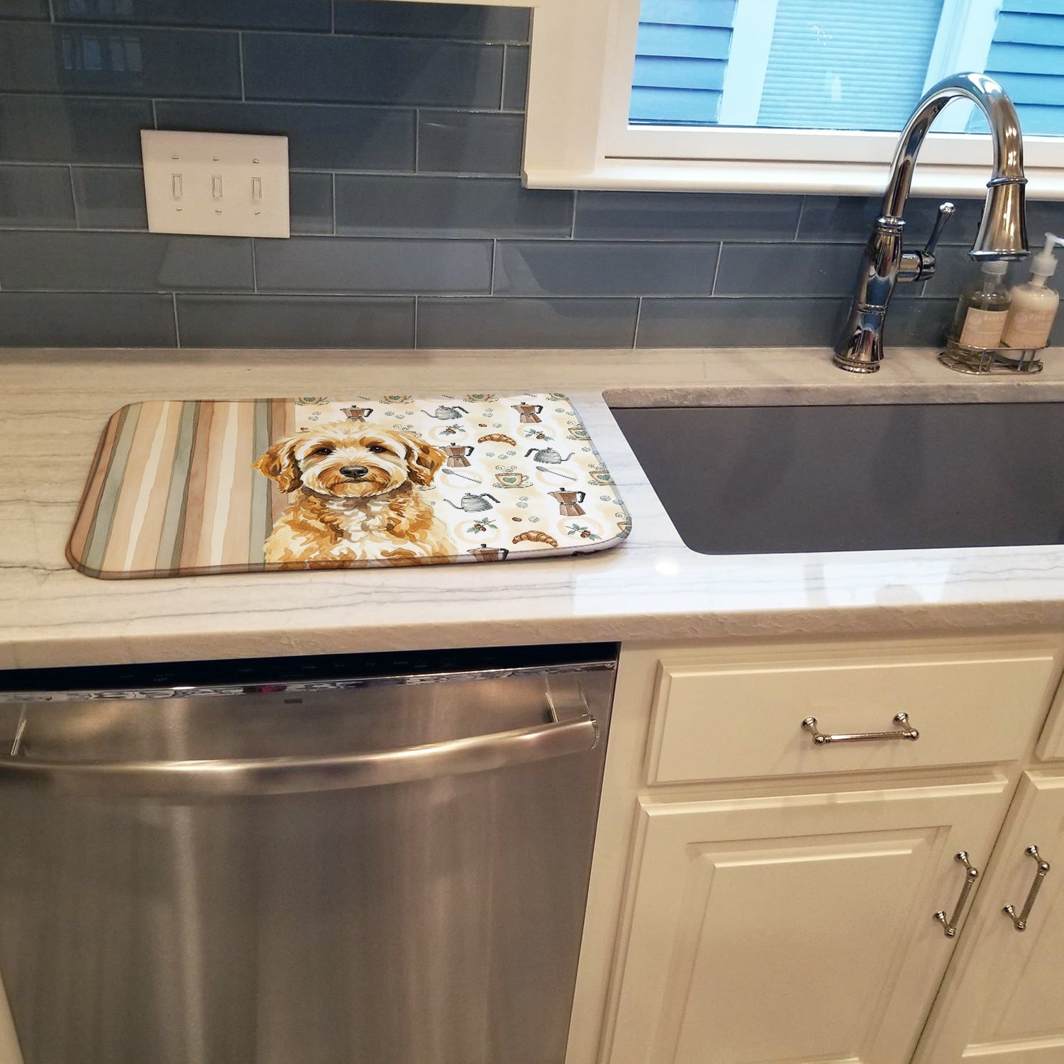 Shown here is the Goldendoodle Coffee Bar Dish Drying Mat from Caroline's Treasures featuring artwork of a Goldendoodle in a Everyday design. The detailed illustration and vibrant colors make it a standout accent that celebrates both seasonal style and love for the subject. This image features a cozy watercolor coffee-themed pattern with illustrated mugs, moka pots, kettles, croissants, coffee beans, and sugar cubes arranged in a repeating design. Soft neutral tones with warm browns, creams, and subtle sage accents create an inviting, café-inspired look that feels comforting and relaxed. Everyday décor celebrates personal style and the small moments that make a house feel like home. Thoughtful designs add warmth and personality that can be enjoyed year-round. Say goodbye to messy countertops and soggy dish towels with our innovative dish drying mat. Our high-quality dish drying pad is designed to keep your countertops dry while offering a stylish and efficient solution. Whether you're air drying dishes, glasses, stemware, silverware, pots, pans, bottles, or even fruits and vegetables, our dish mat is the perfect choice. The 14 inches x 21 inches size fits most counters and dish drying racks, and the non-slip design ensures stability. Made with water-absorbent polyester and a polyurethane foam insert, our dish drying mat is not only functional but also durable. It's machine washable and printed in the USA for long-lasting use. The beautiful artwork adds flair to your kitchen decor, making it a perfect housewarming gift or present for any occasion. Upgrade your kitchen experience with our absorbent and versatile dish drying mat. Perfect for: Kitchen counters and sinks, everyday dish drying and countertop protection, Dogs-themed homes, or year-round use for Goldendoodle lovers. Goldendoodles are popular hybrid dogs known for their friendly personality and intelligence. A mix of Golden Retriever and Poodle, this breed is loved for its affectionate and family-friendly nature. Makes a heartfelt gift for: Goldendoodle owners, Dogs lovers, Everyday gifts, pet parents, friends who adore their Goldendoodle, or anyone celebrating Dogs.