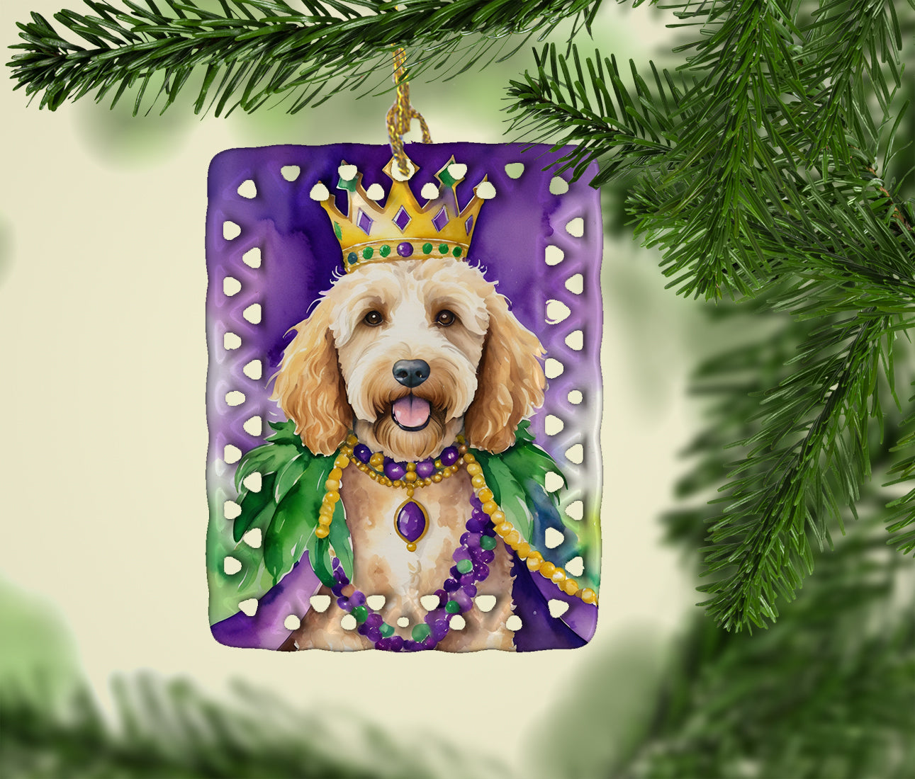 Porcelain Ornament featuring breed specific Goldendoodle artwork. Celebrate Mardi Gras with this Mardi Gras Ornament. Add a unique, personal touch to your holiday decor with our Rectangular Lattice Porcelain Ornament. Perfect for creating cherished memories, this high-quality ornament shines under festive lights, reflecting warmth and joy throughout your Christmas tree. Crafted with a glossy finish, it showcases vibrant, full-color artwork contributed by our talented artists, ensuring your tree is adorned with a burst of color and holiday spirit. What sets this Porcelain Ornament apart is its customizable white back. Use a paint pen or permanent marker to write a heartfelt message, commemorate a special year, or mark an unforgettable date, turning this ornament into a keepsake that will be treasured for years to come. For best results, allow any personalization to dry thoroughly before handling. Each ornament comes complete with a delicate gold cord, making it easy to hang and display. Proudly made in the USA, this ornament measures 3.375 x 2.625 inches and is a thoughtful gift for pet sitters, teachers, family members, or anyone who would appreciate a little extra holiday magic. Bring style, charm, and a touch of personal meaning to your Christmas tree with this beautifully designed ornament..