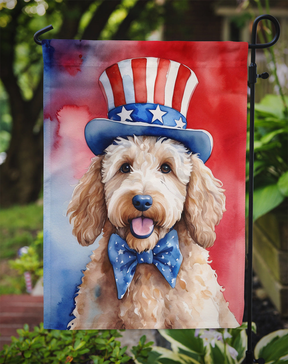 Decorate your space with our Goldendoodle artwork on a Garden Flag. Enhance the beauty of your garden, patio, or yard with Caroline's Treasures Decorative Garden Flag, proudly made in the USA. Crafted from two pieces of thick, double-sided polyester fabric, this 2-ply garden flag is designed to withstand various weather conditions, making it water-resistant and weatherproof. Featuring correctly readable words on both sides, this garden flag offers a delightful visual experience from any angle. With its heavier weight, it stands out among other garden flags, ensuring stability and durability even in wind, rain, and snow. Measuring approximately 11 1/4 inches by 15 1/2 inches, this flag allows you to personalize your outdoor decor. It comes with a 1 1/2-inch sleeve sewn in, allowing easy attachment to any standard garden flag stand or garden size porch hanger (sold separately). Make a statement in your outdoor space with Caroline's Treasures Decorative Garden Flag, a vibrant and high-quality flag that adds color and personality to your surroundings. Proudly made in the USA, it's a symbol of quality craftsmanship and attention to detail.