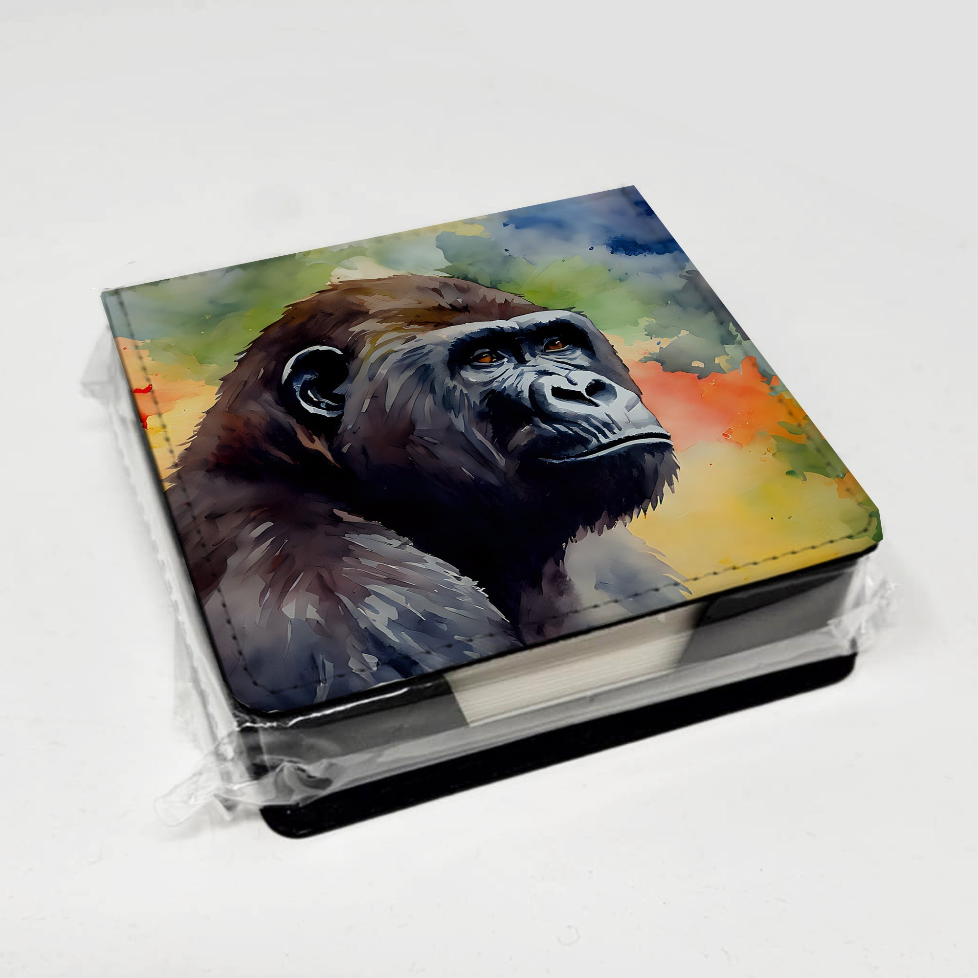 PU Leather Note Paper Holder featuring breed specific Gorilla artwork. Elevate your workspace with this PU Leather Note Paper Holder, crafted to resemble luxurious leather without the use of animal products. Made from durable synthetic PU leather, it offers both a premium look and eco-friendly appeal. This note holder, compactly sized at 4.25 x 4.25 x 1.25 inches, includes about 160 sheets of 3.75 x 3.75-inch note paper—ideal for quick notes and reminders. An exclusive artist-designed cover makes each holder uniquely vibrant, adding a splash of color and personality to any desk or office. The discrete design keeps note paper hidden, maintaining a neat and organized workspace. Perfect as a gift or for personal use, this stylish holder is refillable with standard paper, ensuring long-lasting utility. A must-have for anyone seeking a sophisticated, artful touch to their workspace while supporting animal-friendly products. Add style, organization, and creativity to your everyday routine with this elegant note paper holder.