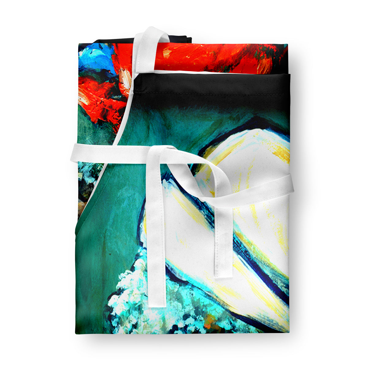 Elevate your cooking, baking, and grilling experiences with our versatile Kitchen or BBQ Apron. This Bib Style apron isn't just limited to culinary activities - it also serves as an excellent baking apron, artist apron, server apron, gardening apron, or even a dog grooming apron. The apron showcases vibrant full-color artwork contributed by one of our talented artists, bringing a dash of style to your daily tasks. With dimensions of approximately 27"W x 30"H, it provides ample coverage to protect your clothing from spills and splashes. Our apron is meticulously crafted from 100% Ultra Spun Polyester, known for its durability and lightweight nature. The apron comes with white tie straps, ensuring a comfortable and adjustable fit for all. It's a perfect choice for kitchen apron enthusiasts, whether you are a woman or a man. Designed for easy maintenance, this apron is fully machine washable. The quick-drying polyester material actively reduces staining, keeping your apron looking fresh and new for longer. Our beautifully designed apron isn't just a functional kitchen accessory - it's a fashion statement in the culinary world!