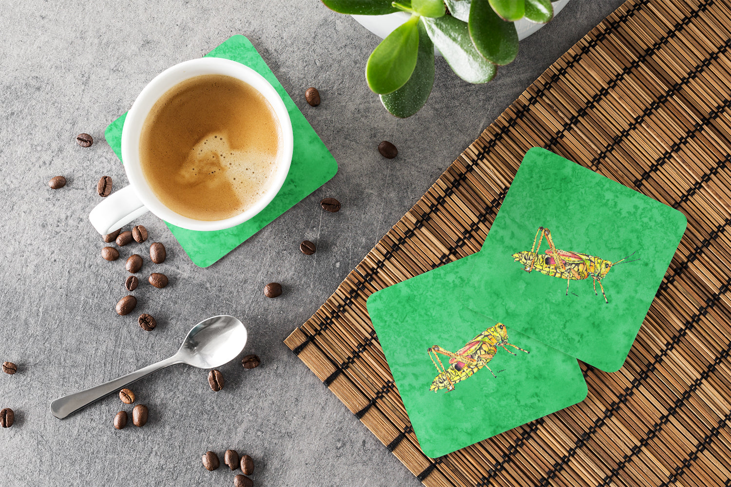 Grasshopper on Green Coasters - Set of 4 Lightweight Foam, Absorbent Drink Coasters